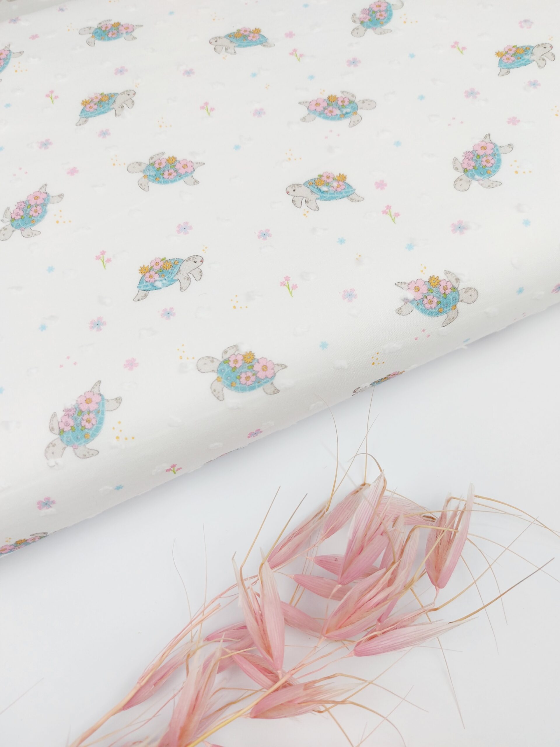 El diseño está protagonizado por encantadoras tortuguitas en tonos suaves, con caparazones en azul aguamarina decorados con pequeñas flores en rosa empolvado, amarillo mostaza y tonos pastel. Entre ellas, se dispersan diminutas florecitas y detalles puntuales que crean un conjunto armonioso, delicado y muy primaveral 🌷