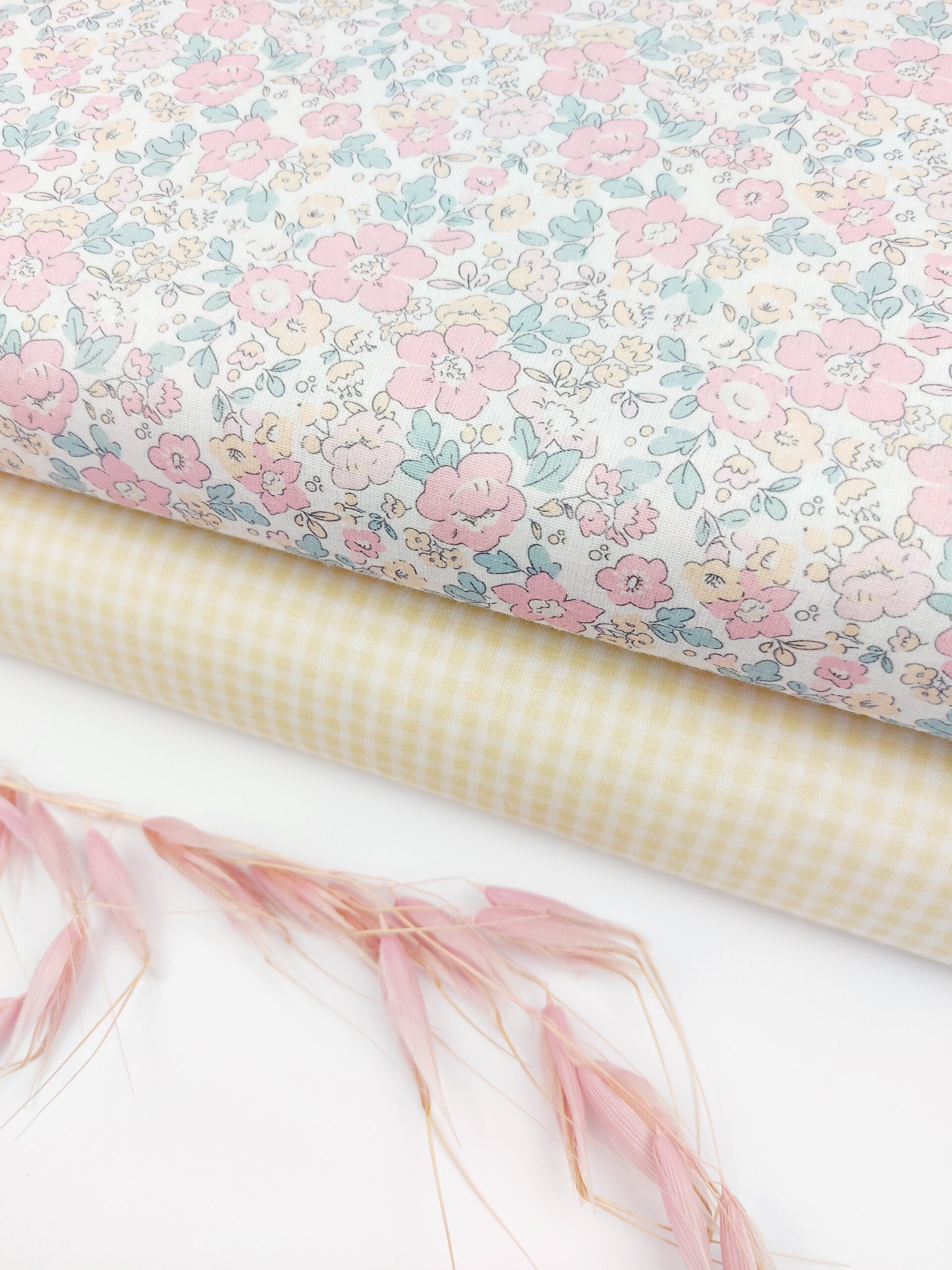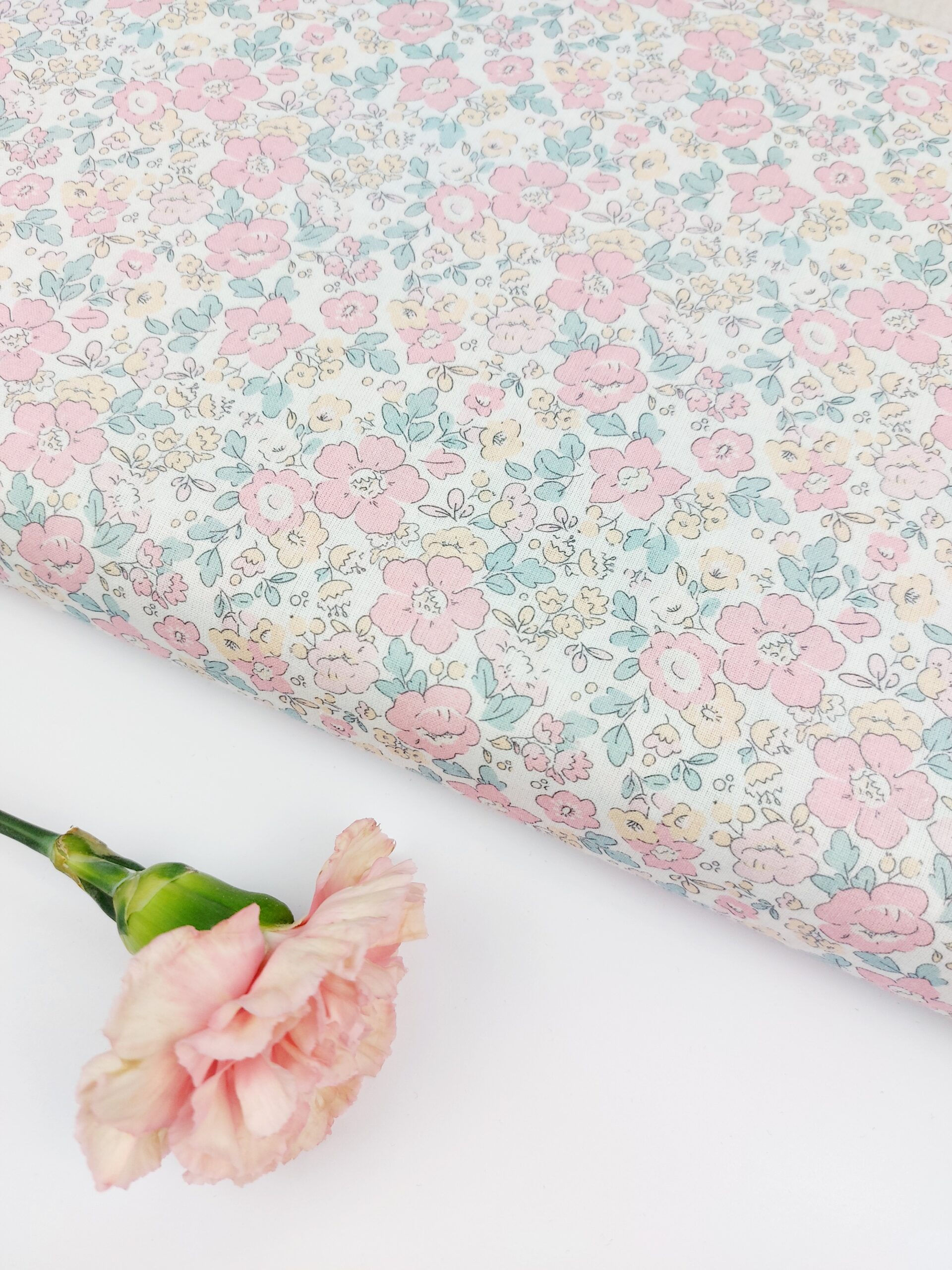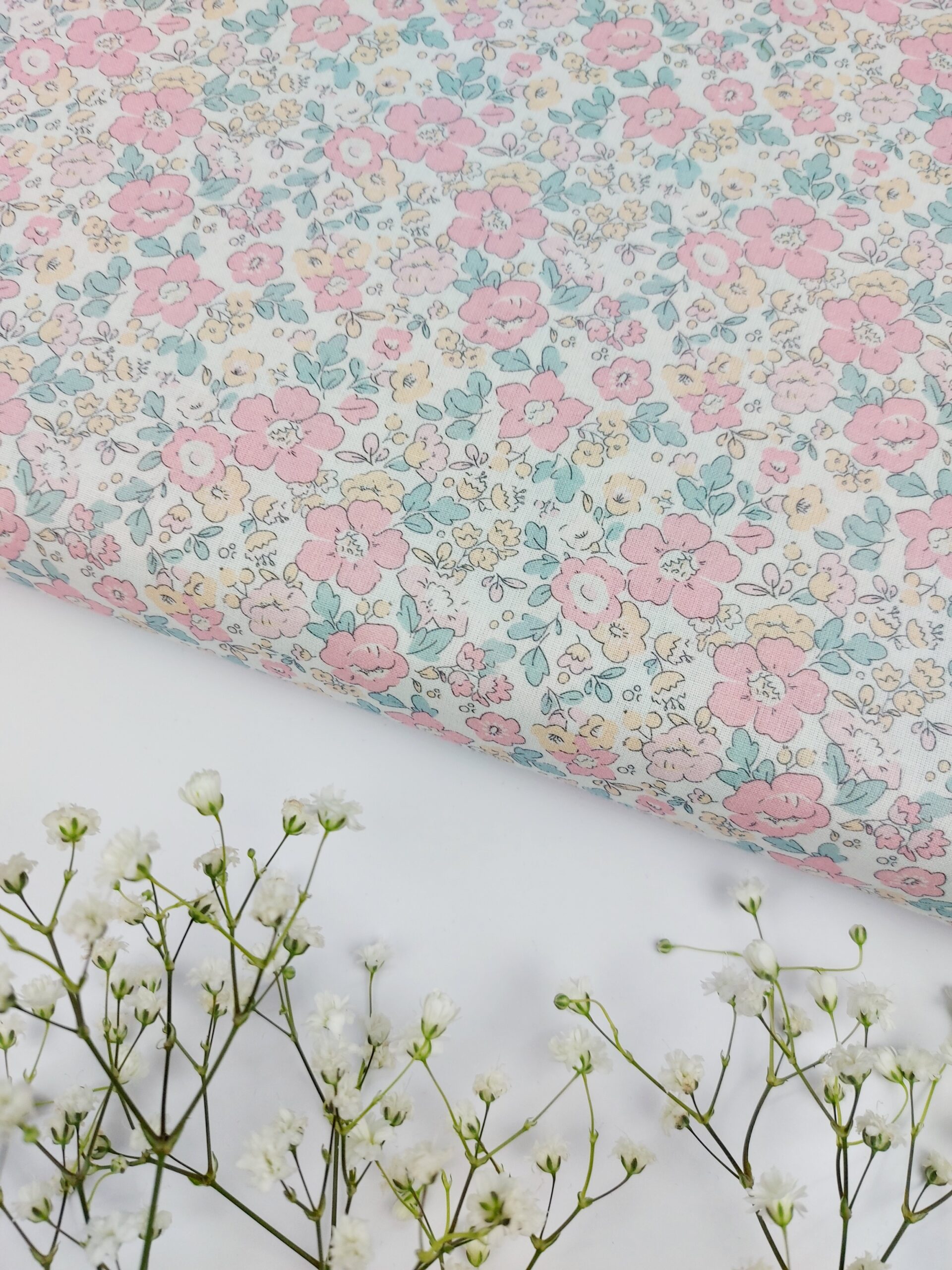 Este popelín 100% algodón presenta un diseño de flores en tonos rosa, amarillo pastel,  rosa claro, con delicadas hojas verde menta sobre fondo blanco. Su estilo Liberty lo convierte en una opción ideal para quienes buscan un tejido romántico, alegre y atemporal. Medida detalle: 3cm mide la flore de ancho.