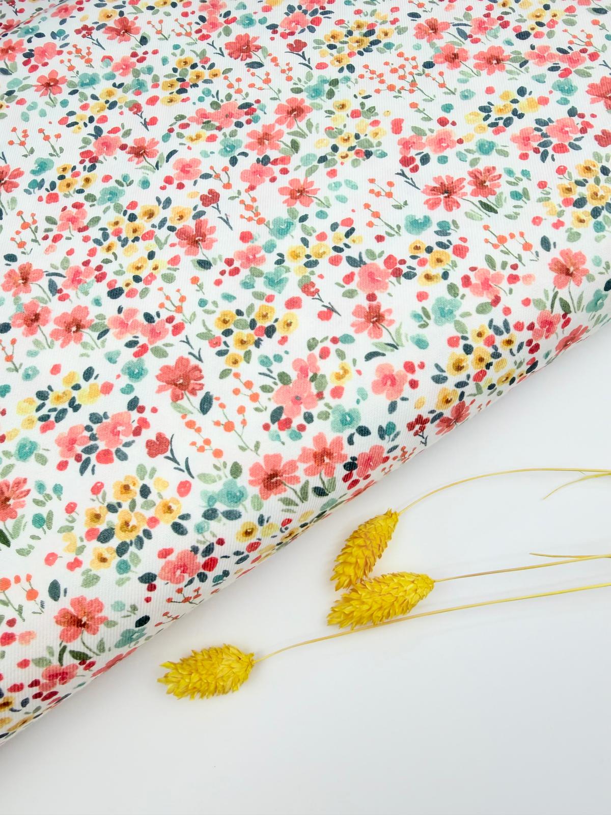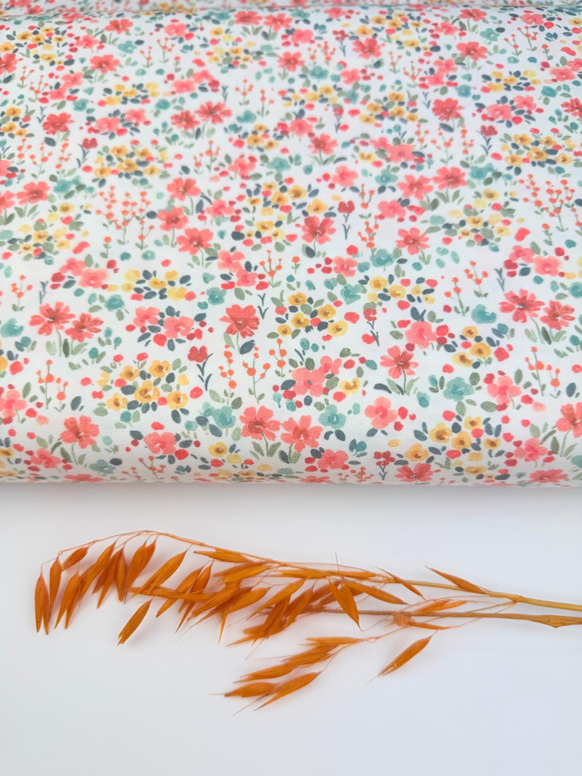 Una viyela llena de vida y dulzura que evoca un campo en flor🌼. Su estampado combina pequeñas flores en tonos rosa coral, verdes empolvados y toques mostaza sobre un fondo claro, creando una composición alegre, armoniosa y muy natural 🤍. Medida flor: 1.8cm mide la flor en color rosa coral