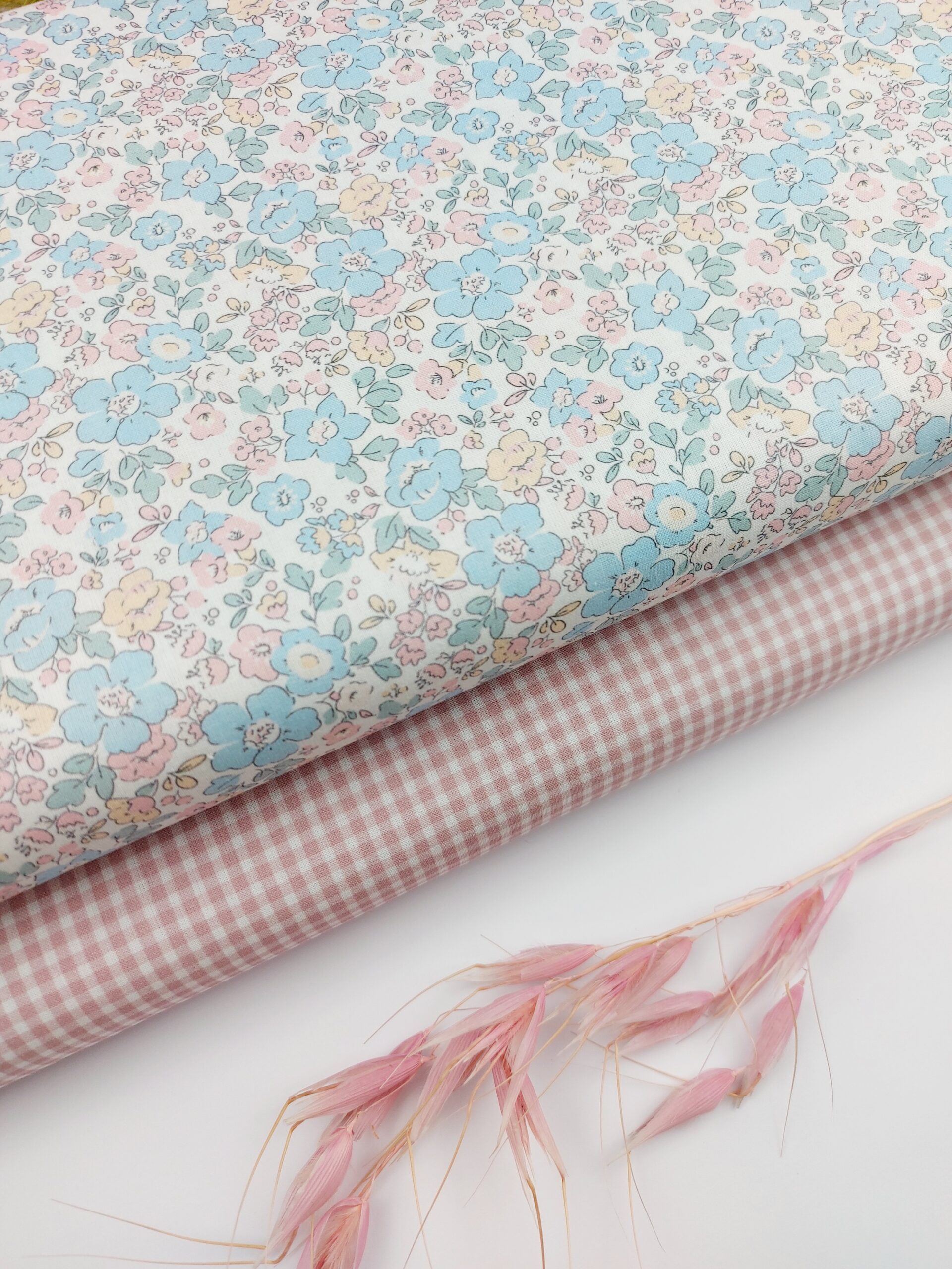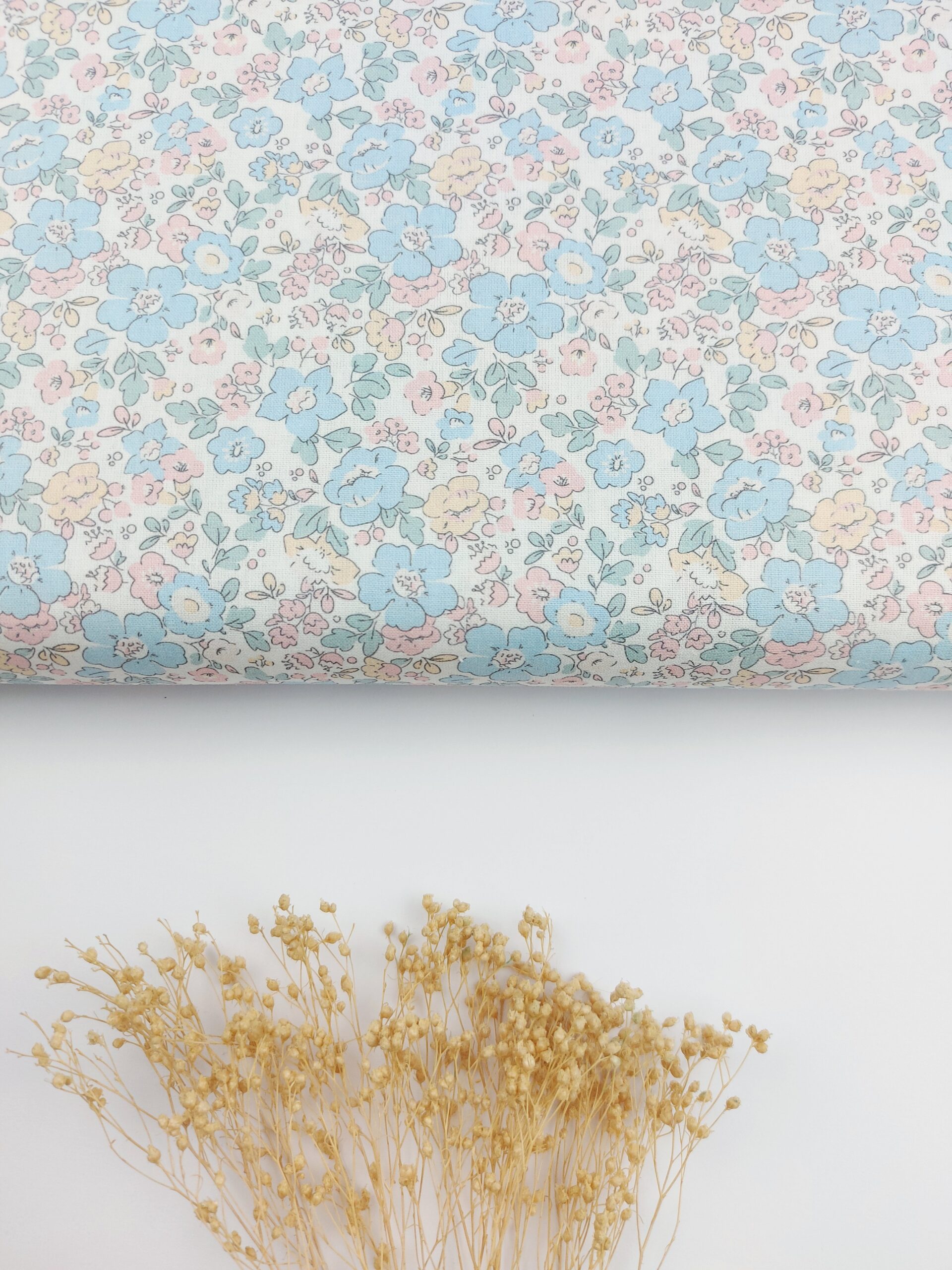 Este popelín 100% algodón presenta un delicado diseño de flores en tonos azul cielo, rosa empolvado y vainilla, con pequeñas hojas verde agua sobre un fondo blanco. Su estilo recuerda a los clásicos estampados Liberty , llenos de armonía y romanticismo. Medida detalle flor: 2 cm mide de ancho la flor en color azul.