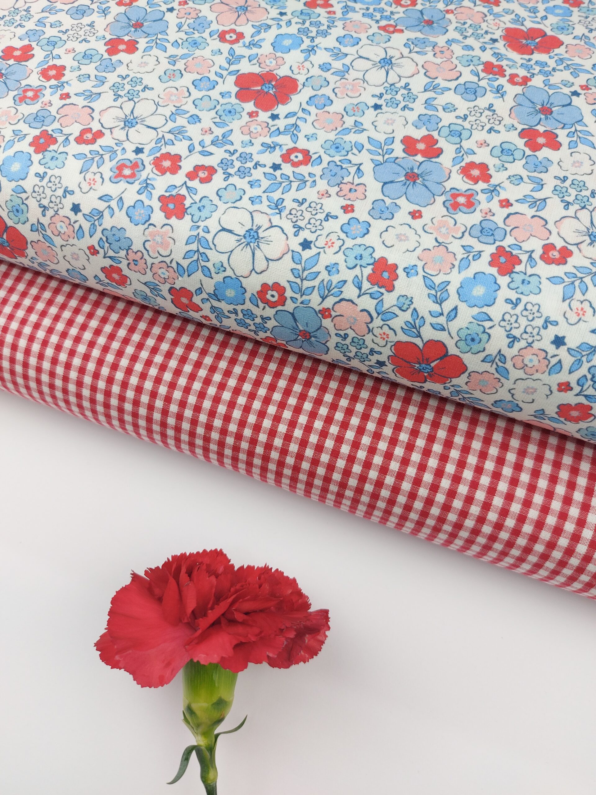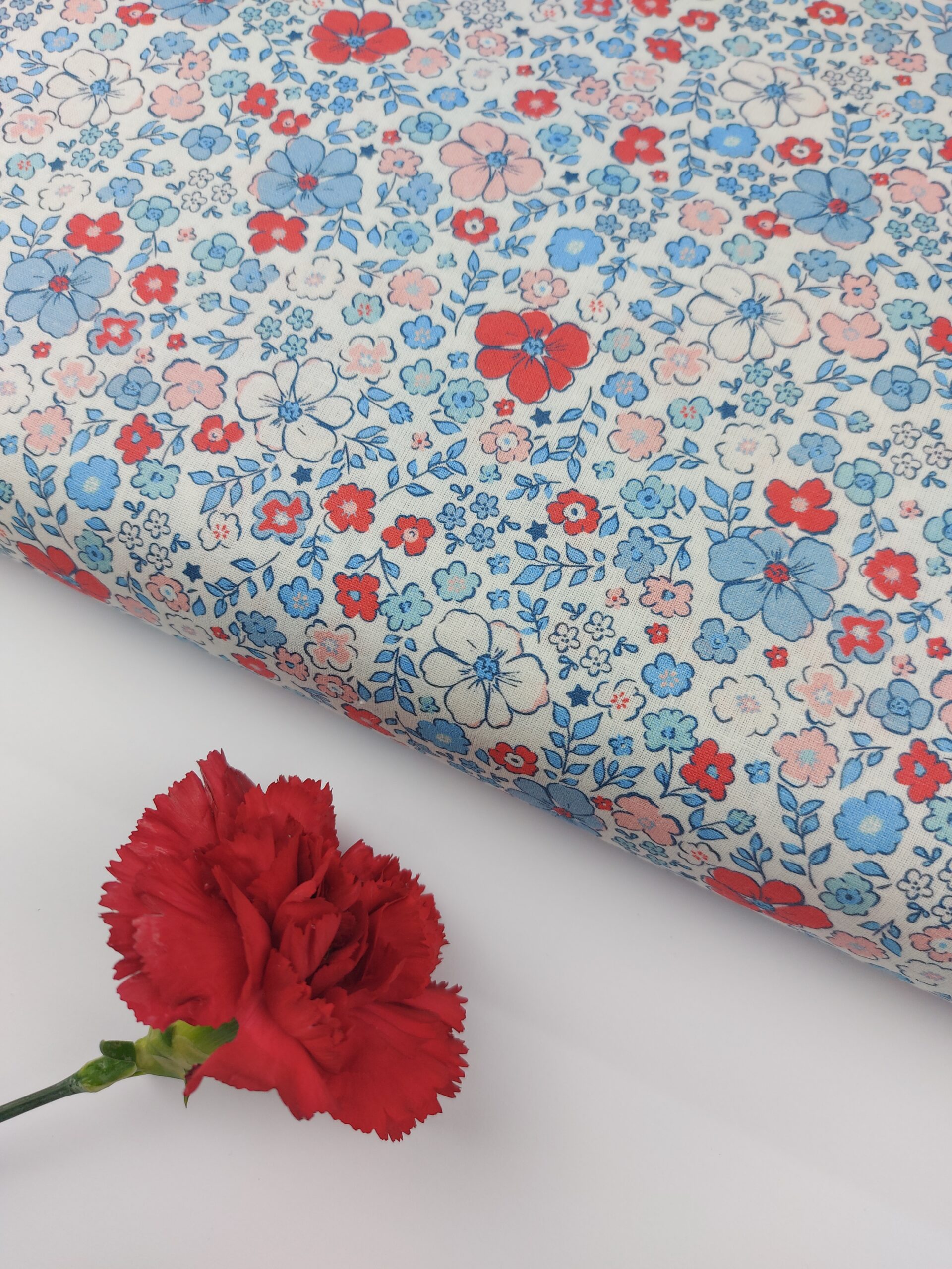 Este precioso popelín presenta un delicado estampado floral de inspiración clásica, con flores distribuidas de forma armoniosa sobre un fondo claro. Predominan los tonos azules suaves, combinados con rojos vivos y toques en blanco y rosa empolvado, creando un diseño fresco, alegre y muy atemporal 🌿❤️