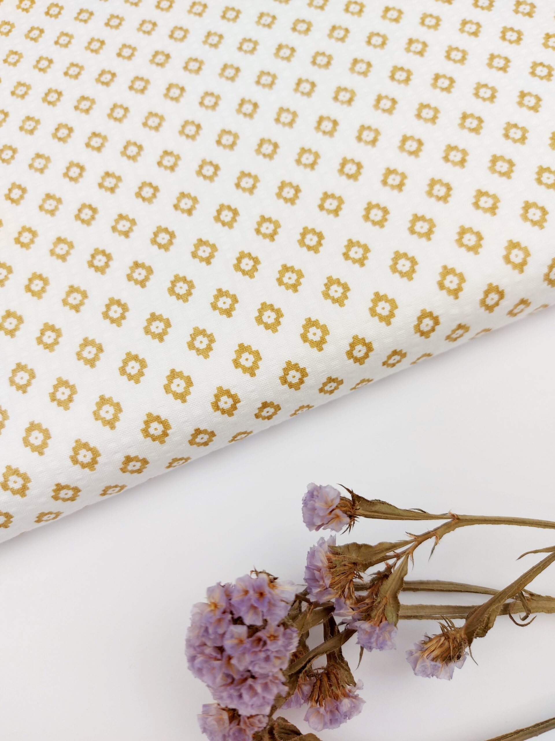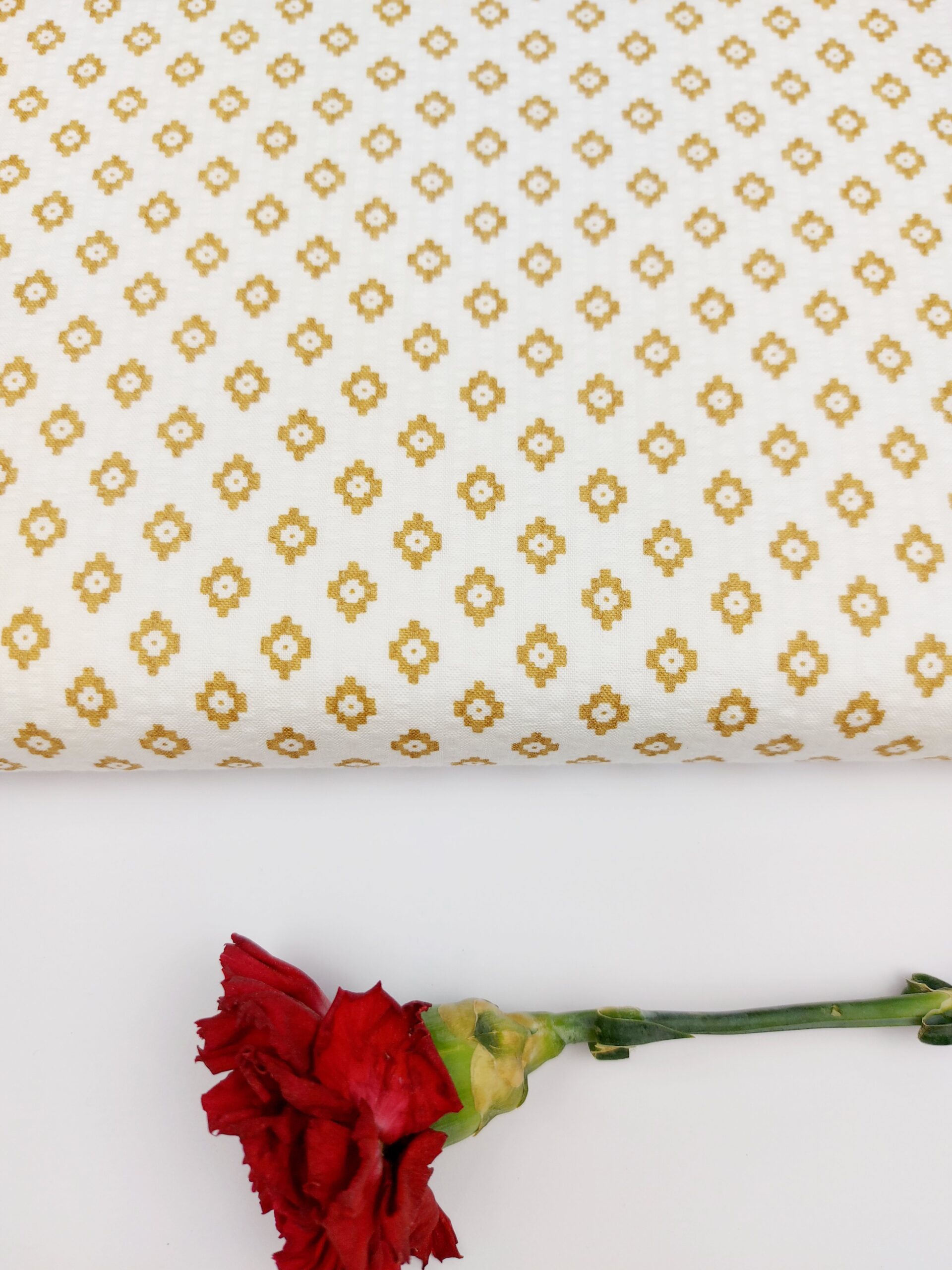 Tela seersucker de algodón con estampado de pequeñas figuras étnicas repetidas de forma regular. El diseño se presenta sobre un fondo blanco roto combinado con motivos en tono mostaza suave, creando un conjunto cálido, sereno y atemporal, con un marcado aire artesanal y mediterráneo creando un contraste sutil y sofisticado. Medida detalle: 1 cm mide alto el dibujo geométrico.. El hilo utilizado en la tejeduría de esta tela es 100% Algodón . La tela ha sido tejida utilizando tensiones entre la trama y urdimbre de la tela, consiguiendo un efecto arrugadito en la tela. Composición: 100% Algodón Ancho Tela: 148cm. Gramaje: 125 gr/m2.
