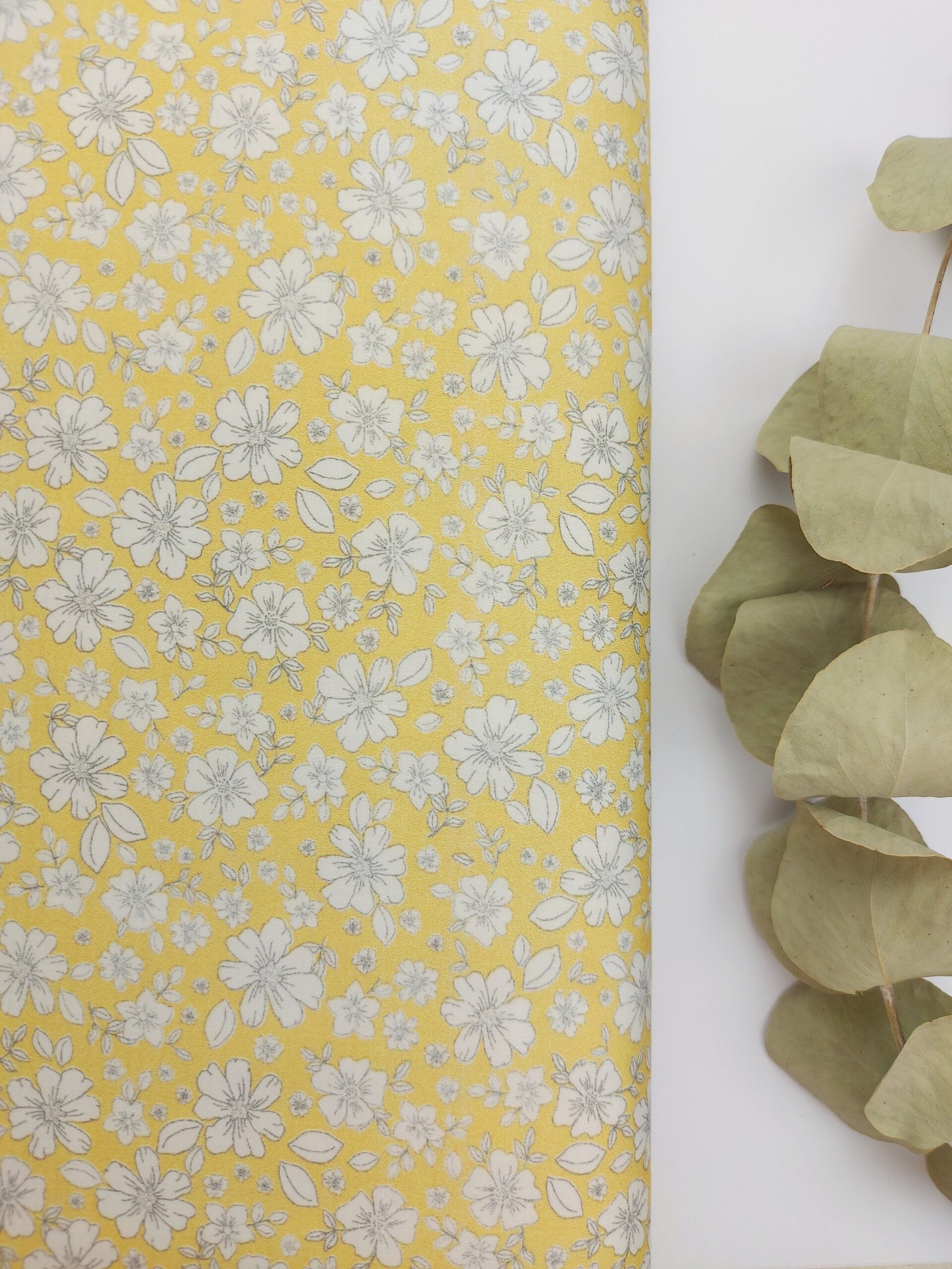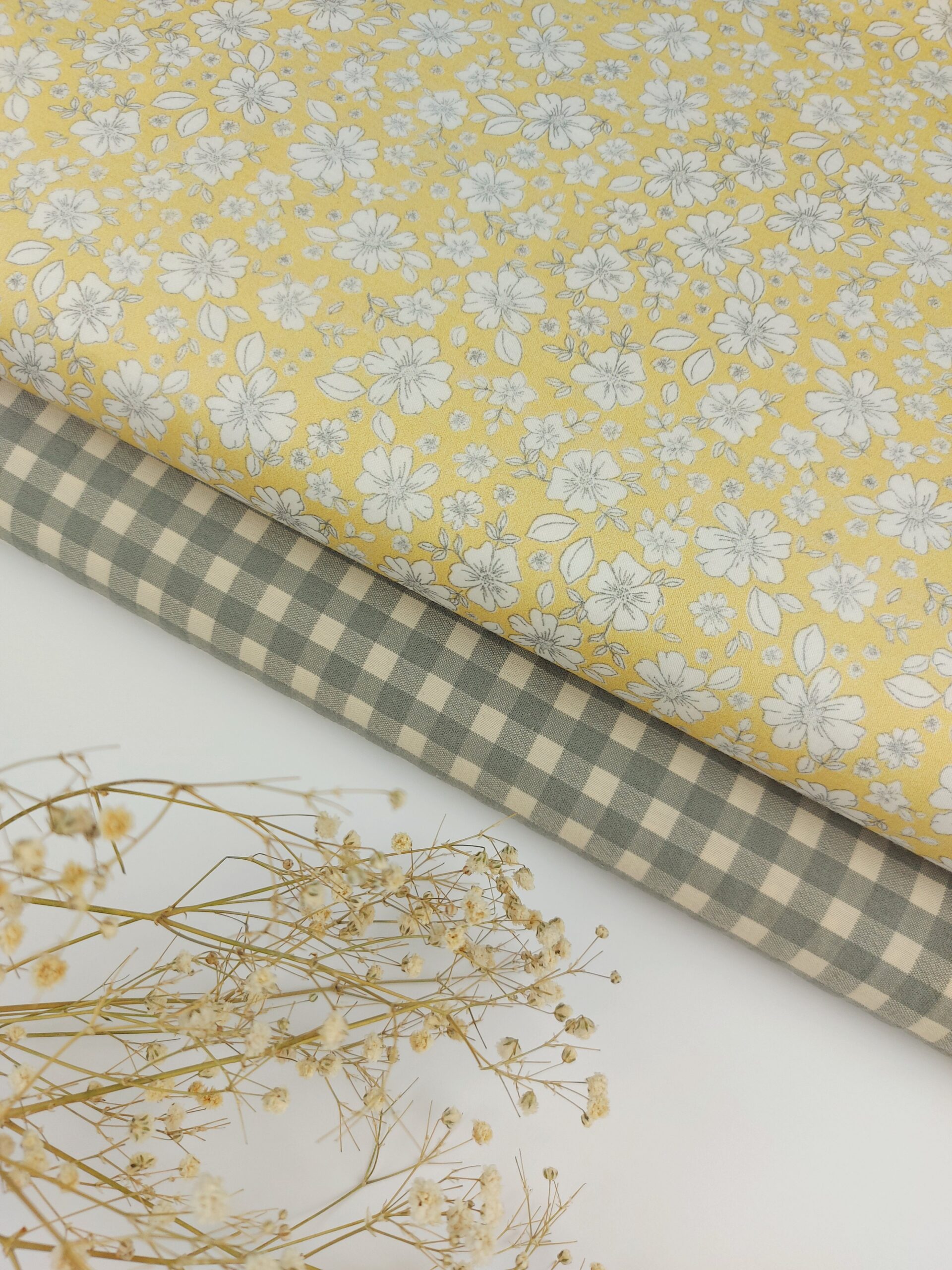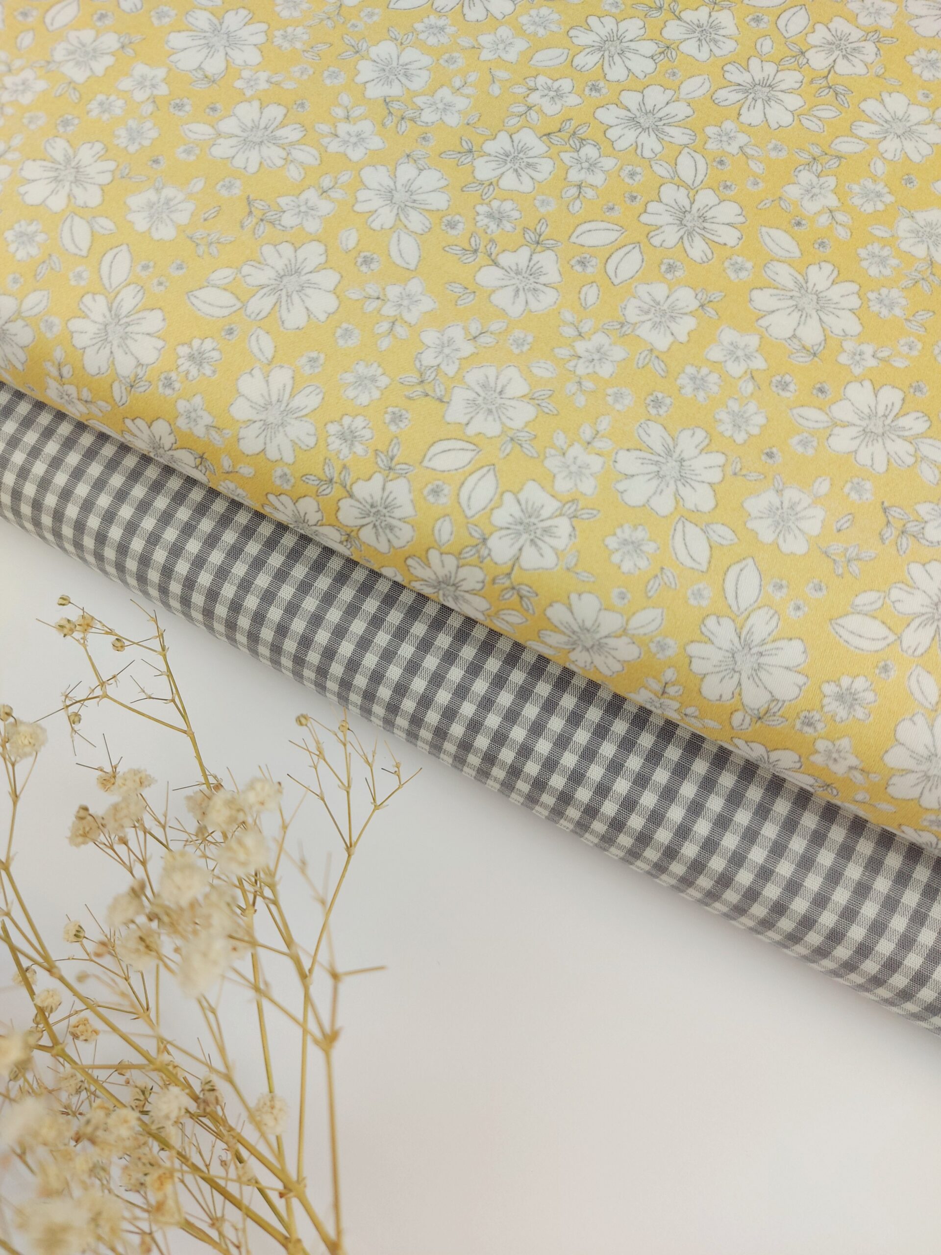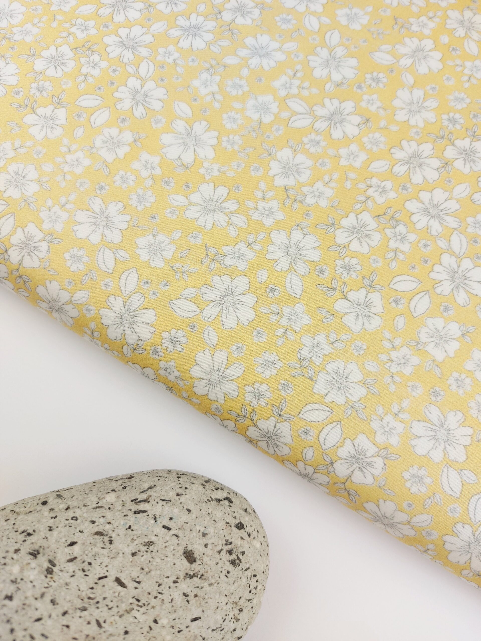 Tela de algodón de batista PREMIUM de fondo amarillo mostaza suave, decorada con un delicado estampado de flores blancas con contorno gris distribuidas de manera uniforme por toda la superficie. Su diseño combina el aire fresco y luminoso del amarillo con la elegancia del contraste en blanco y gris.