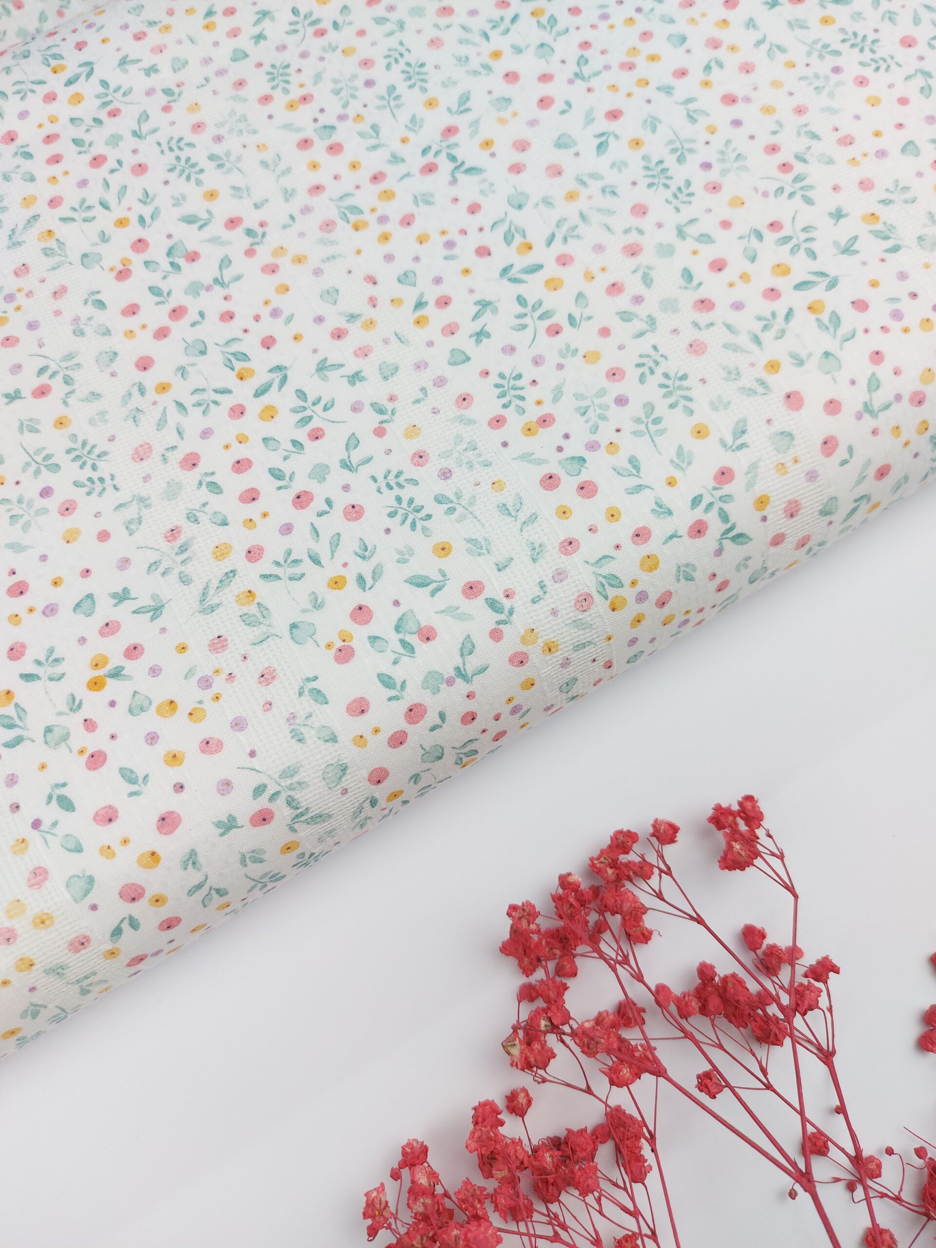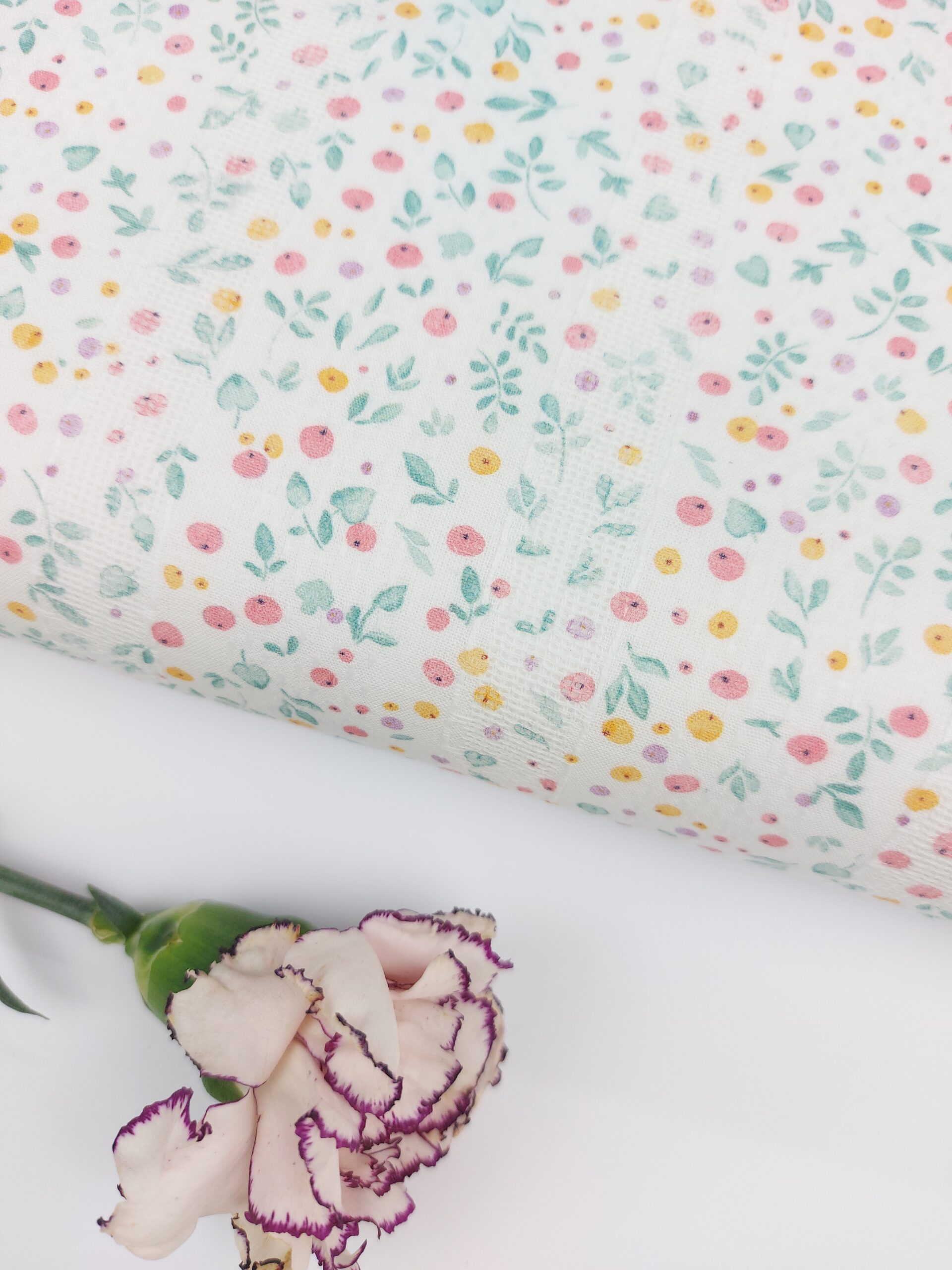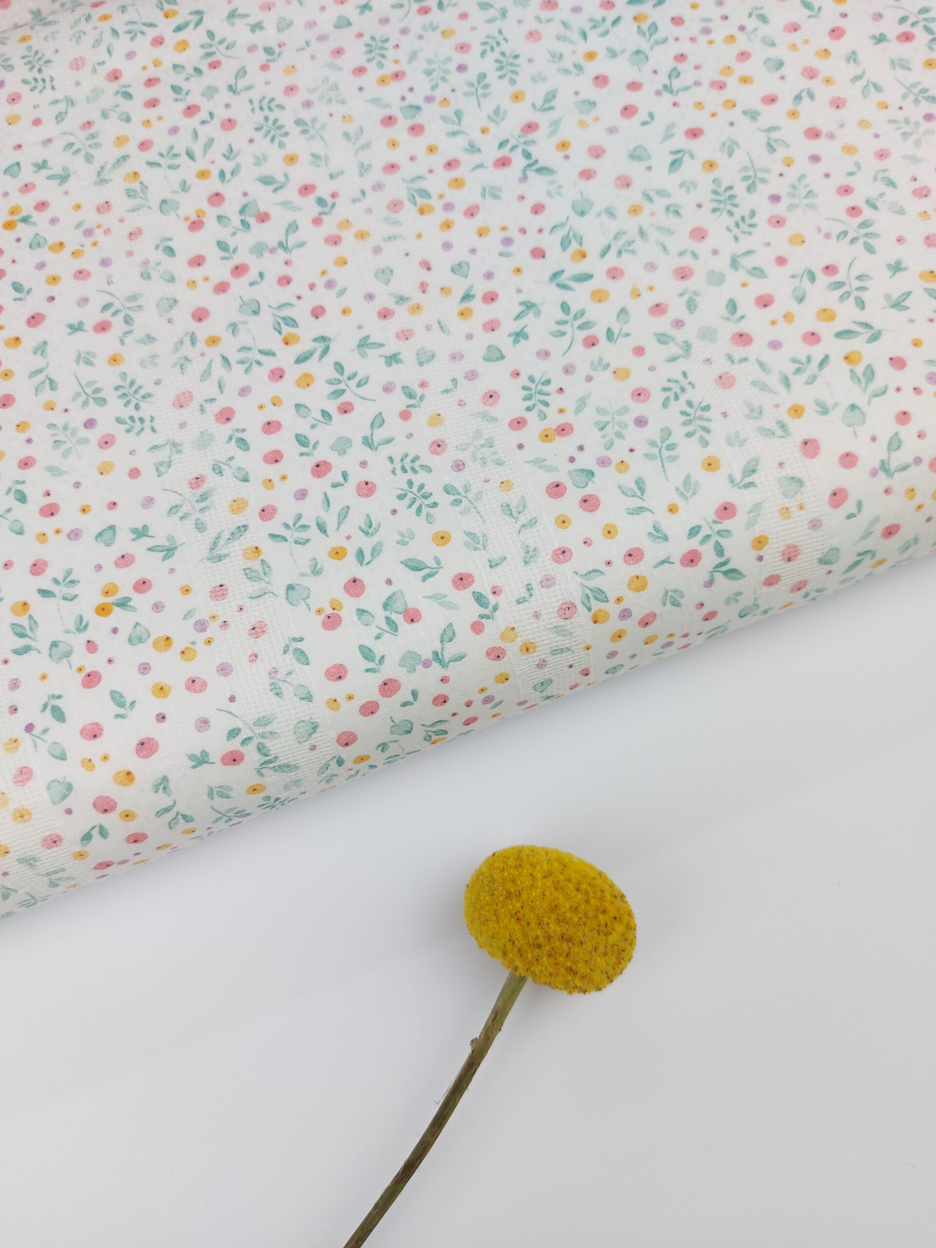 Esta batista de algodón con vainica destaca por su ligereza y su tacto suave y agradable. El tejido incorpora vainicas horizontales con respecto al orillo de la tela que aportan textura, movimiento y un acabado artesanal muy delicado. Sobre un fondo claro se distribuye un encantador estampado floral y botánico de pequeño formato, con ramitas, hojitas y pequeños frutos en tonos empolvados de verde jade, rosa fucsia, amarillo miel y lila delicado.