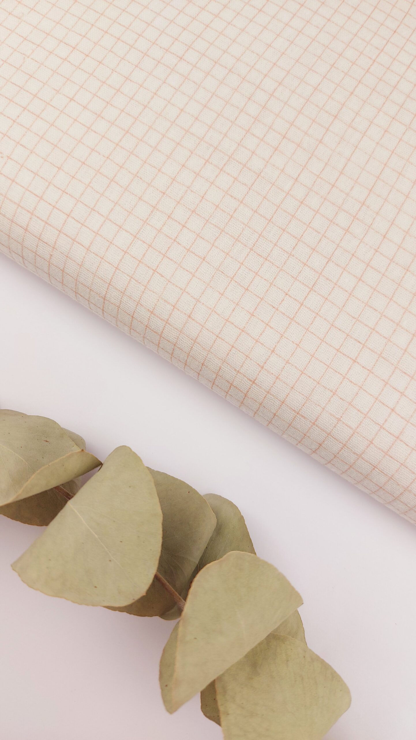 Doble gasa de algodón de fondo blanco crudo con un delicado estampado de rosa nude, que aporta un aire natural, minimalista y muy versátil.