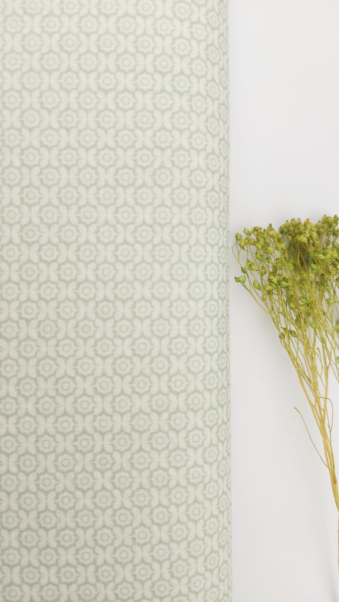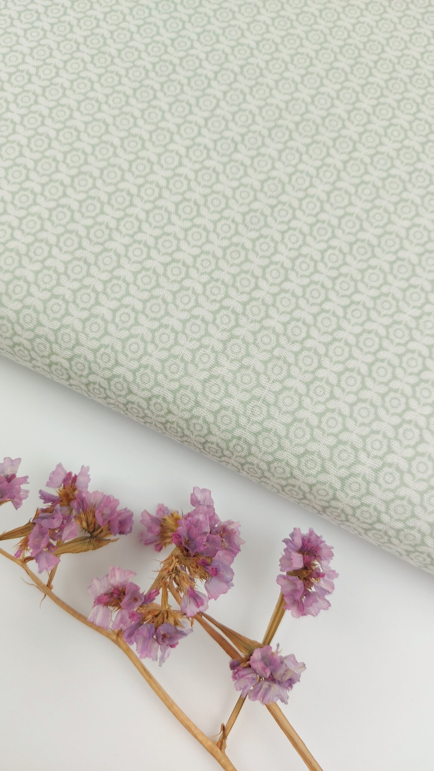 Doble gasa de algodón con base en blanco roto y un delicado estampado geométrico de pequeñas flores circulares en tono verde empolvado. El diseño aporta un aire fresco, natural y muy armónico, ideal para creaciones tanto infantiles como adultas. Medida: 5mm.
