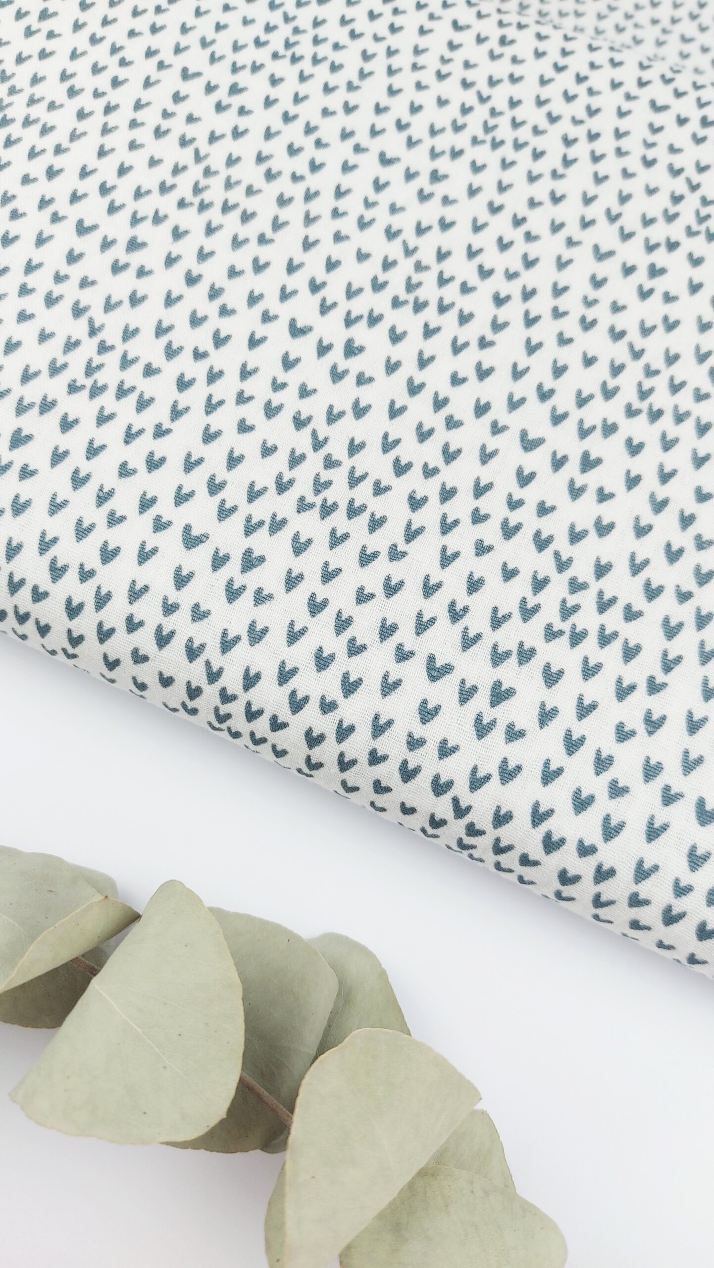 Doble gasa 100% algodón en tono blanco roto 🤍, decorada con un estampado repetitivo de mini corazones en un elegante azul tormenta. Su diseño minimalista y natural aporta un aire delicado, fresco y atemporal, perfecto para prendas y accesorios de inspiración campestre. Medida corazones: 3mm de ancho.