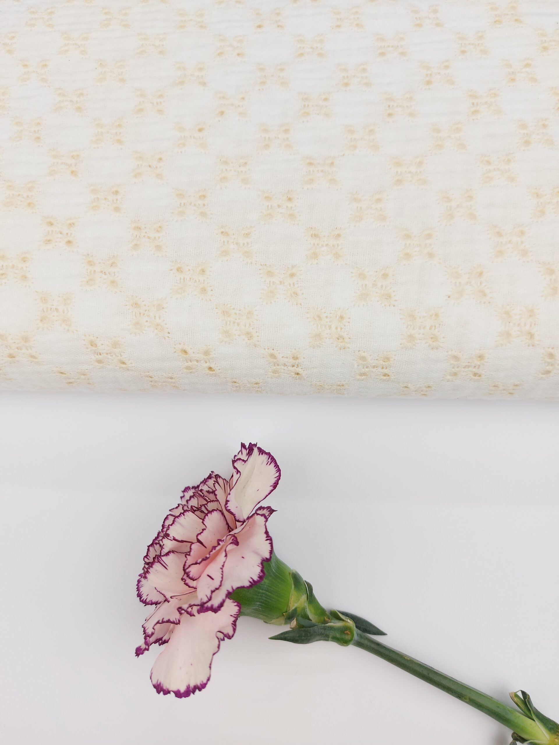 Una doble gasa absolutamente especial, delicada y con un aire romántico que enamora a primera vista ✨. Su base en tono blanco roto se viste con un finísimo bordado en tono vainilla suave, formando un elegante dibujo geométrico con pequeñas flores que se entrelazan creando un efecto armonioso y muy sofisticado 🌿.
