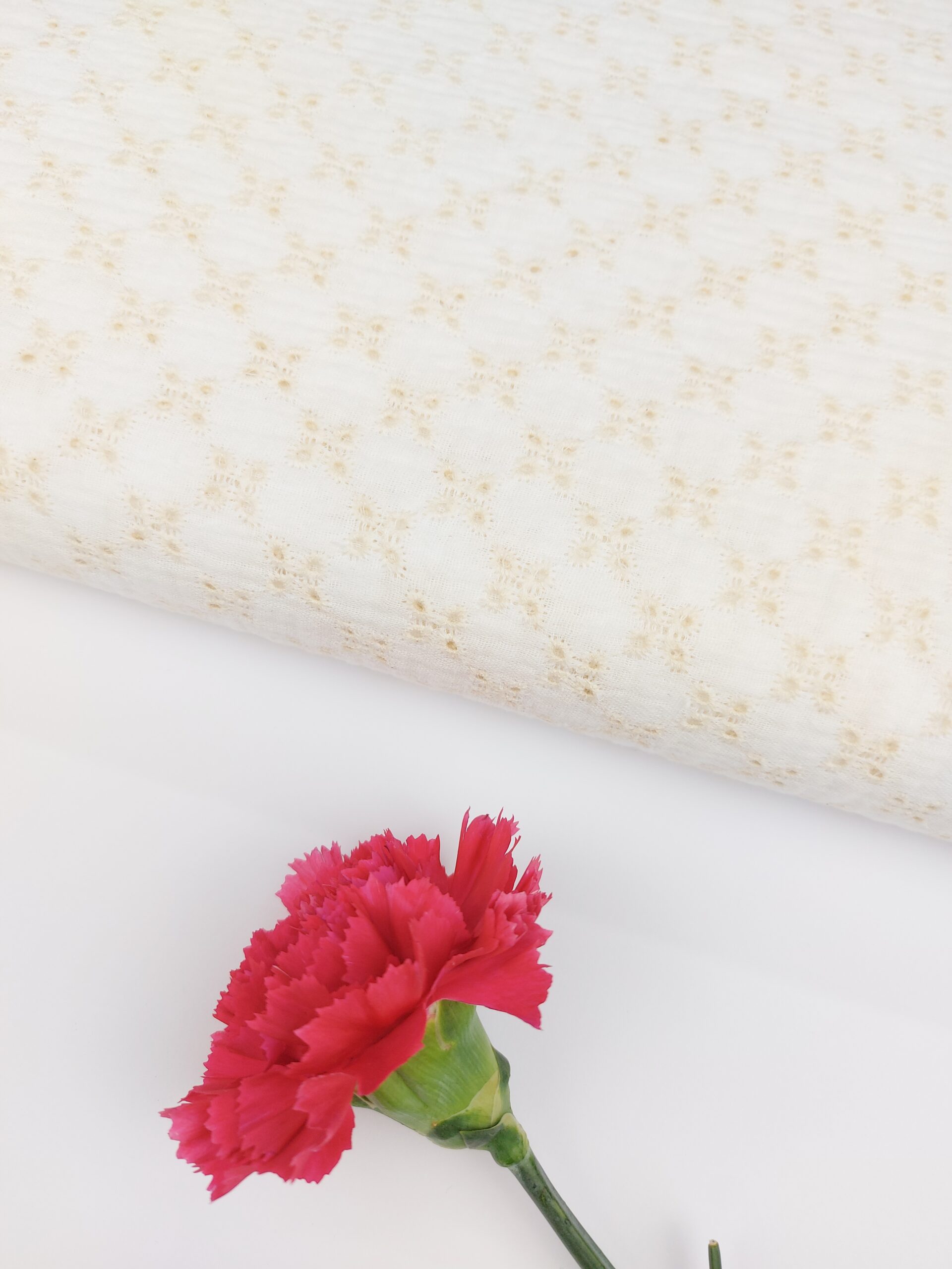 Las pequeñas perforaciones (tipo bordado inglés) aportan ligereza visual y un acabado artesanal precioso, elevando la tela a una categoría más exclusiva y cuidada 💫.
