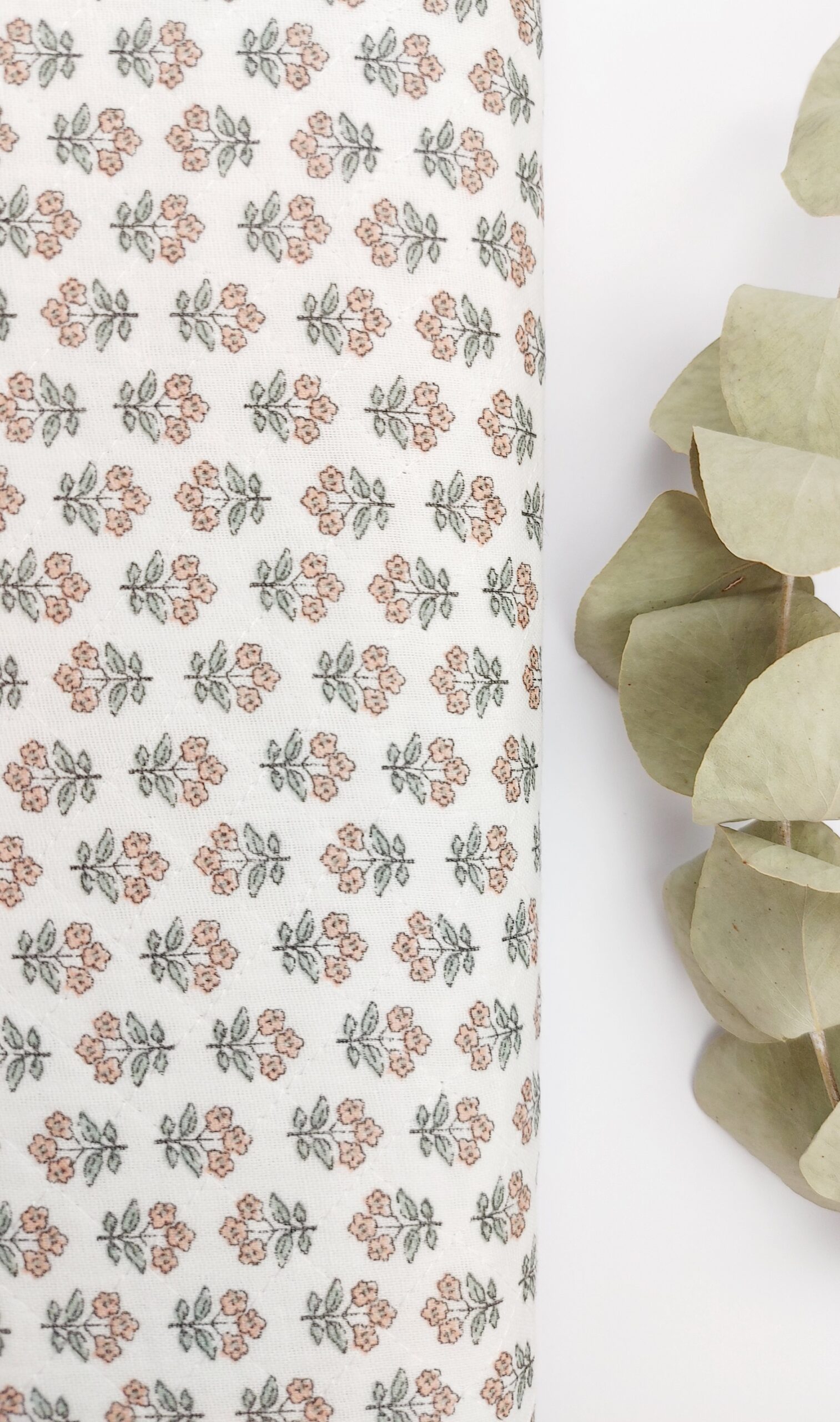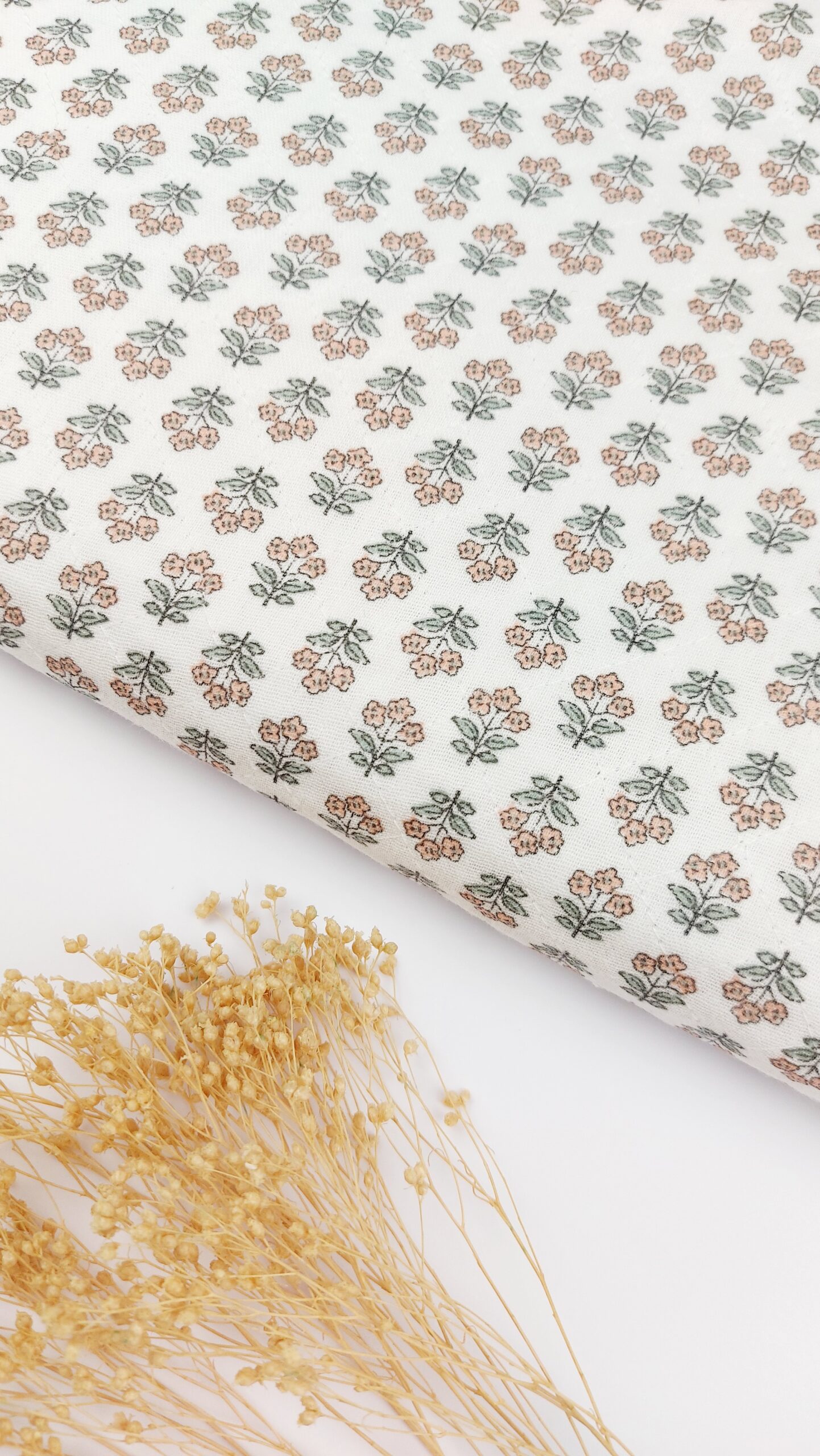 Gasa  con 4 capas de gasa acolchada con pespunte en rombos, muy suave, mullida y cálida. Gasa de algodón en tono blanco con un delicado estampado de ramilletes florales pequeños en colores rosa empolvado y verde suave. El diseño se repite de manera uniforme creando un efecto dulce, romántico y armonioso, ideal para prendas ligeras y con un aire vintage.