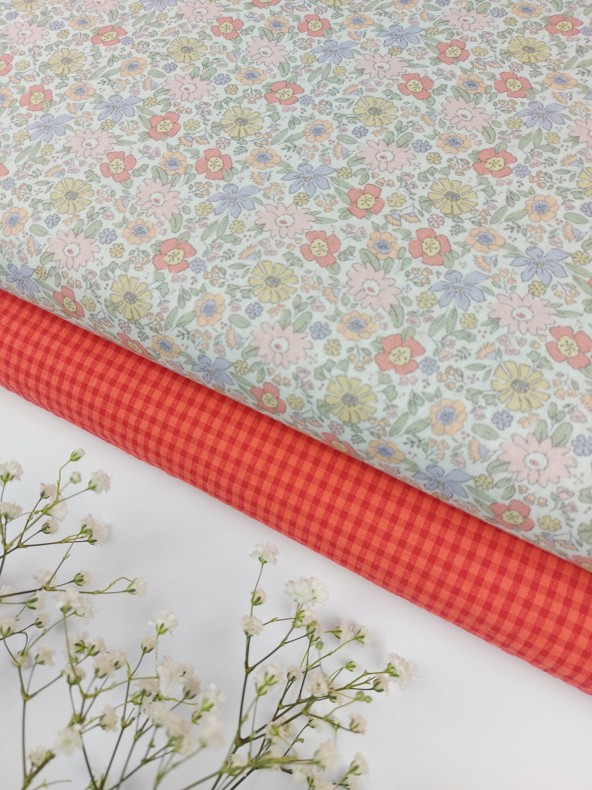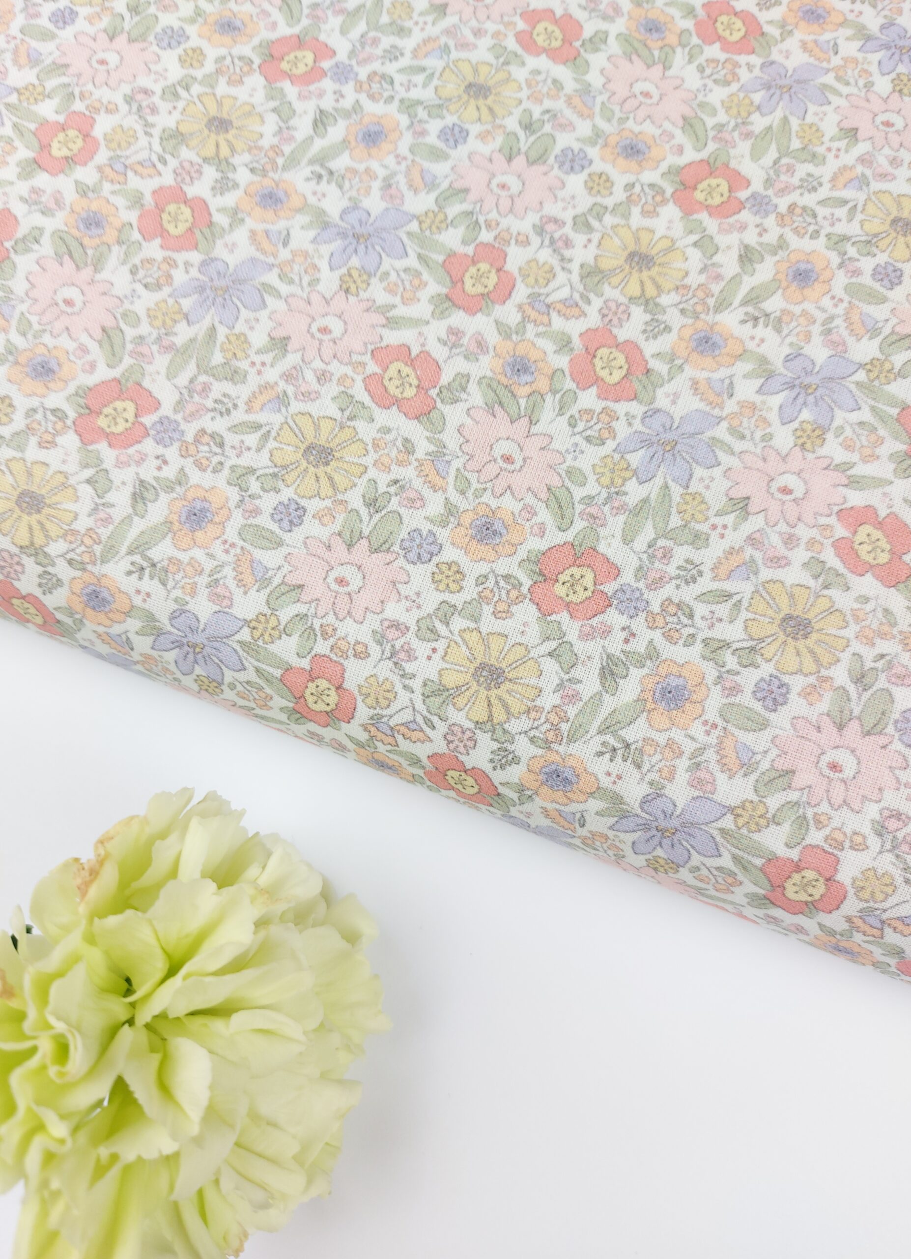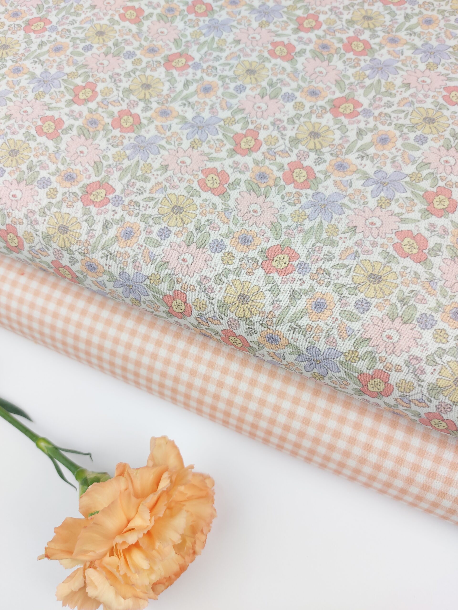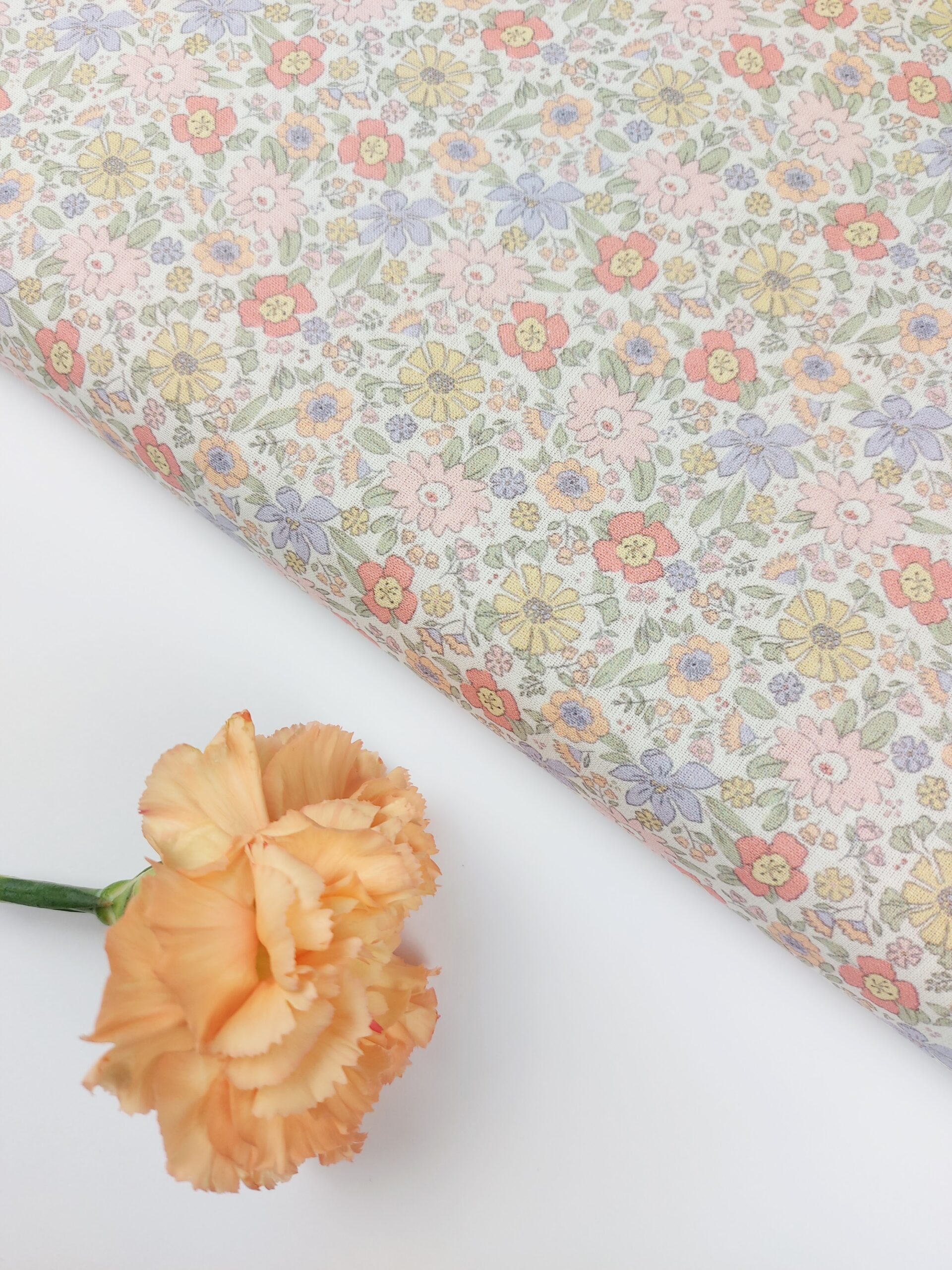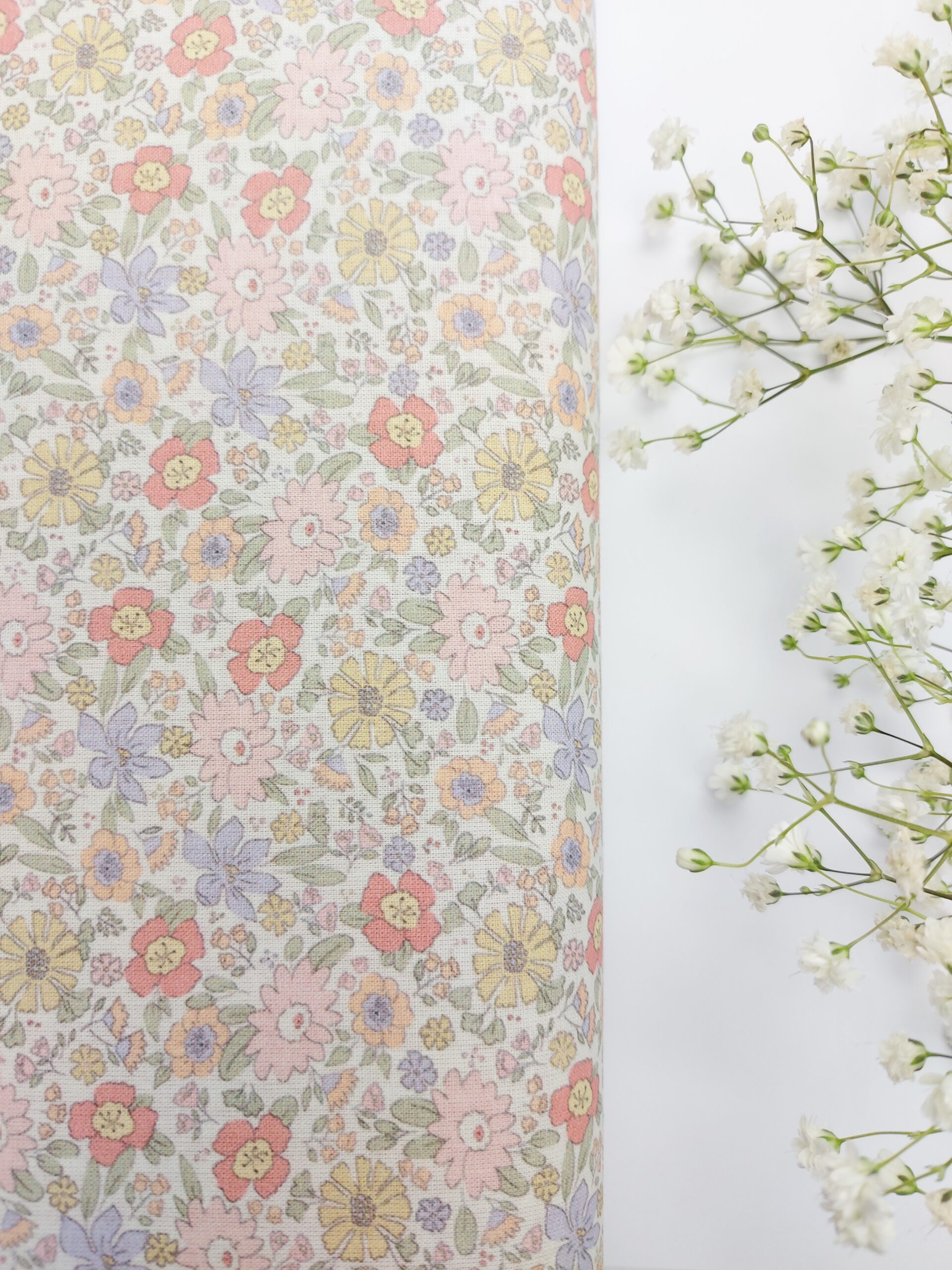 Este delicado popelín presenta un estampado floral de inspiración clásica, con flores pequeñas y medianas distribuidas de forma armoniosa sobre un fondo claro. La paleta combina tono mandarina, rosa empolvado, amarillo suave, lila delicado y verde salvia, creando un conjunto luminoso, cálido y muy equilibrado 🌷🌿Medida de la flor: 1.5 cm.