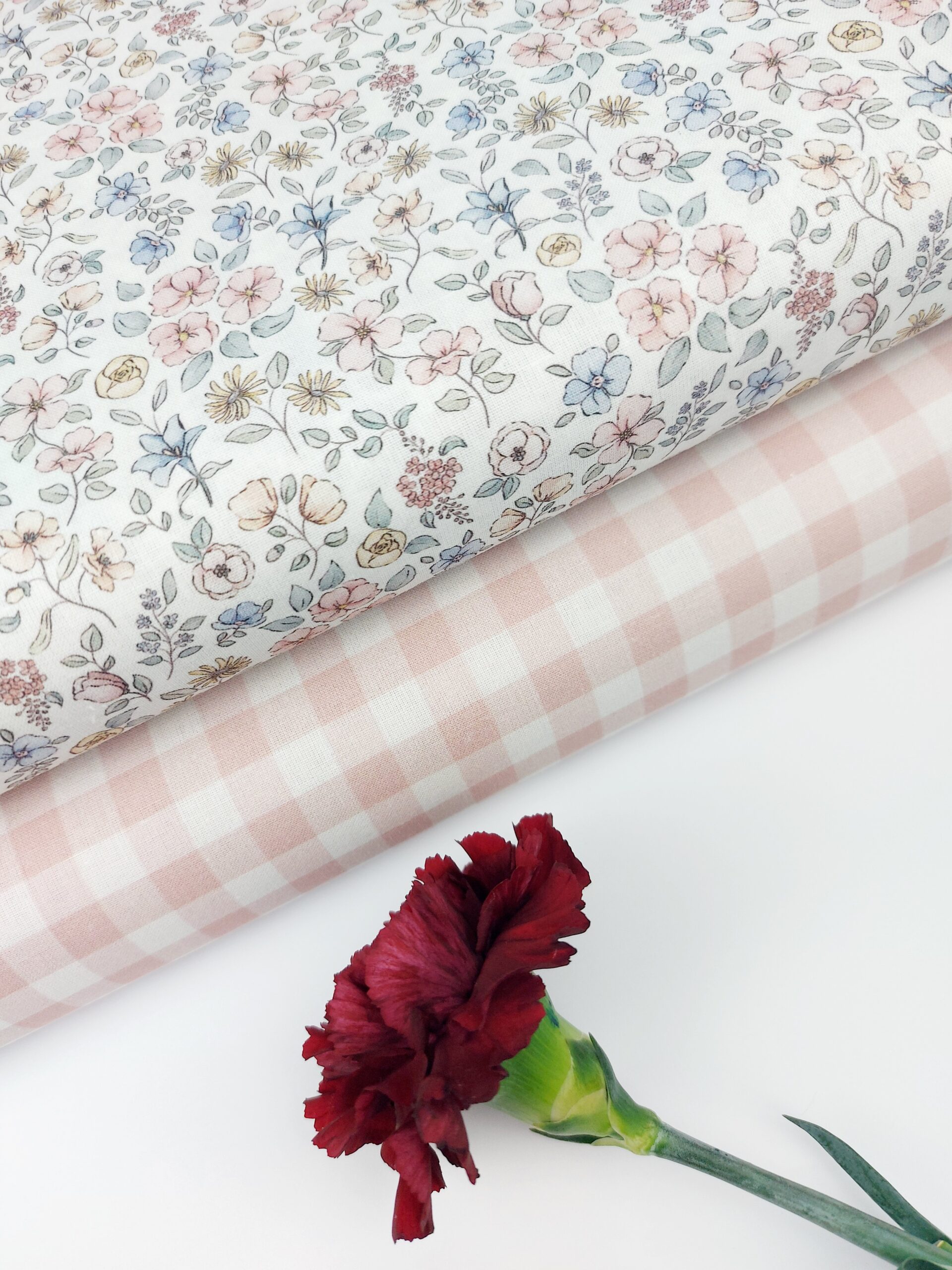 Popelín de algodón con un precioso estampado floral de estilo romántico y dibujo fino, distribuido de manera armoniosa sobre un fondo blanco. . El diseño combina flores en tonos rosa empolvado, azul grisáceo empolvado, beige suave y verde salvia, amarillo suave con pequeños detalles que recuerdan a ilustraciones botánicas clásicas, aportando un aire elegante, dulce y atemporal.