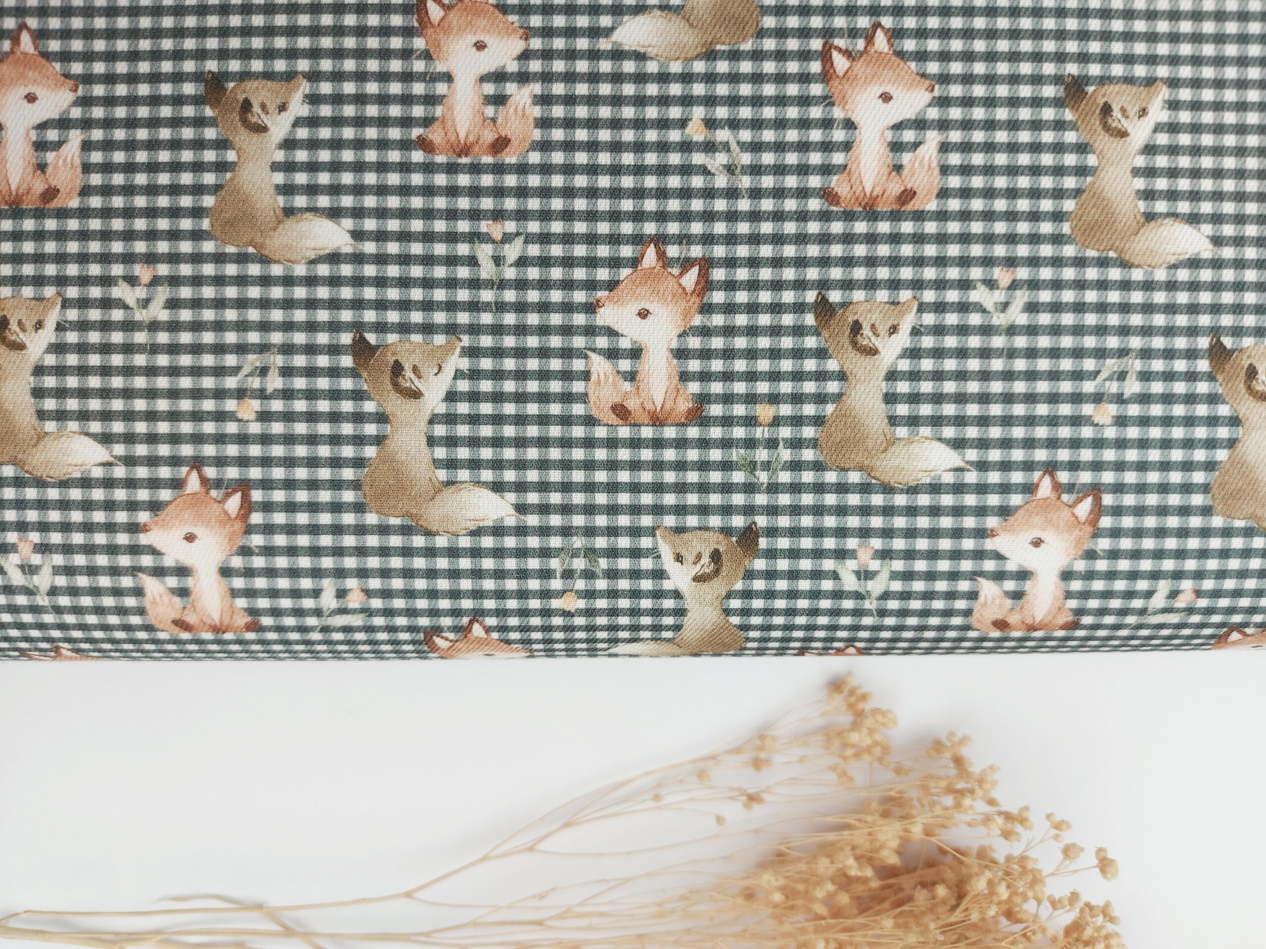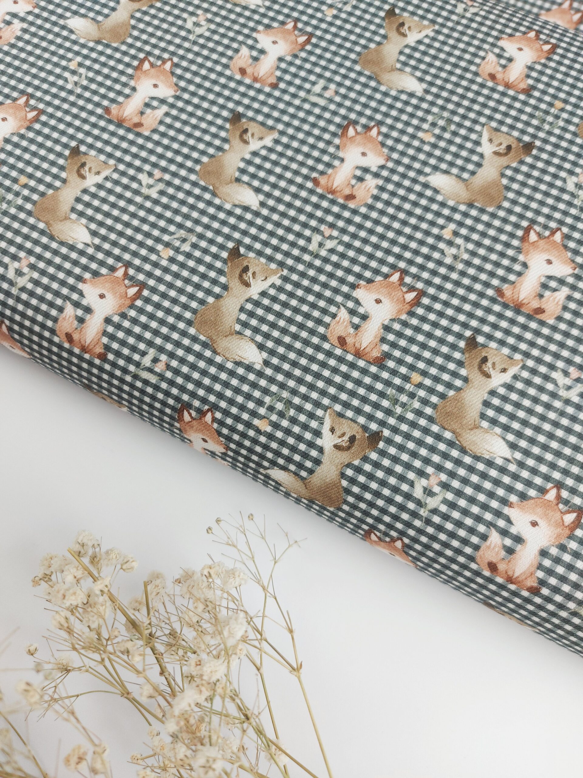 Tela de algodón con estampado de cuadrito vichy en gris antracita y blanco, decorada con zorritos en tonos marrones arcillosos y marones beige distribuidos de forma armónica por toda la superficie. Los zorros aparecen en diferentes posiciones, aportando dinamismo y ternura al diseño, acompañados de pequeños detalles florales en tonos suaves. Medida detalle: 3mm mide el cuadro y el zorrito de alto: 2.5 cm
