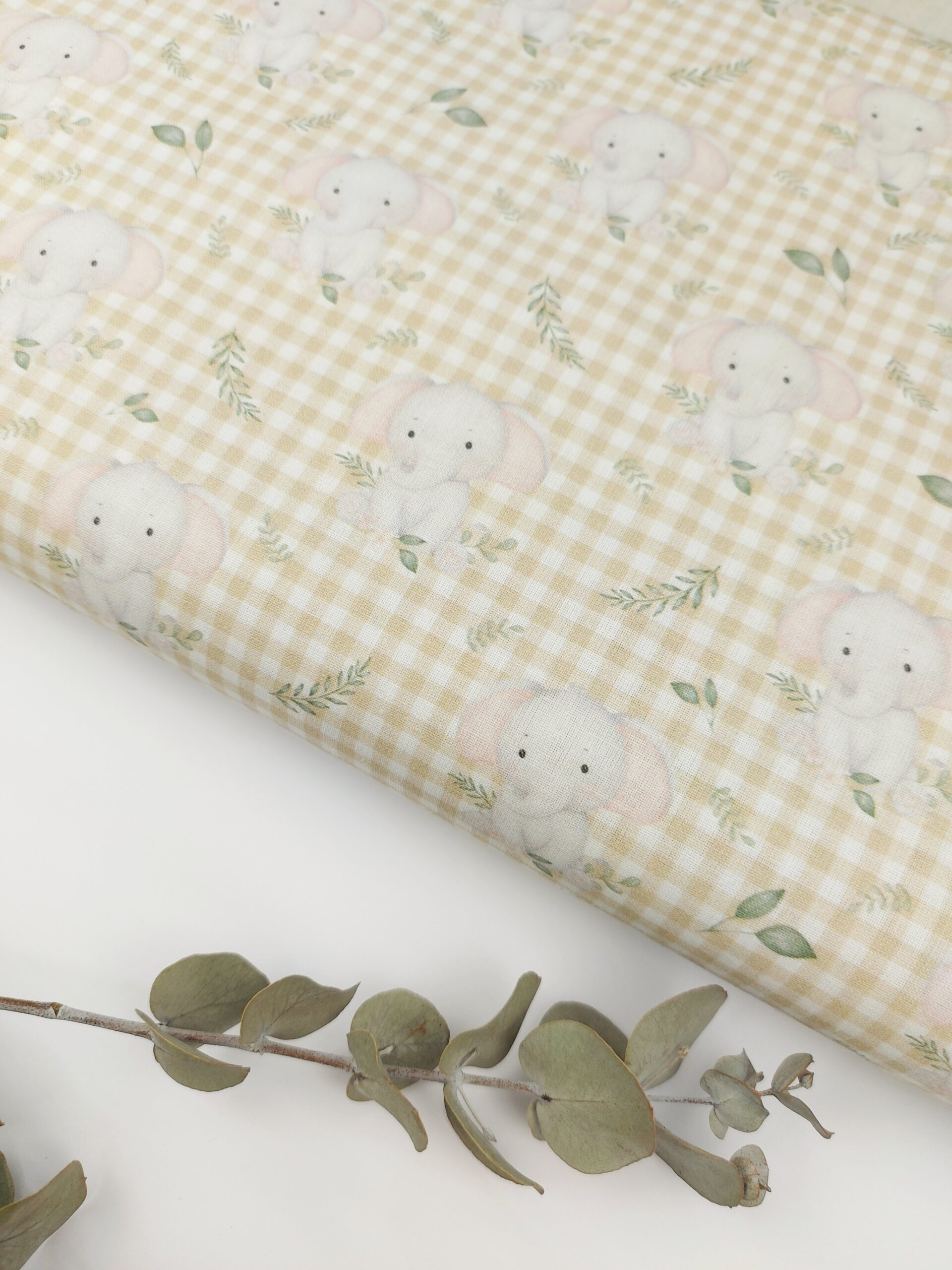🐘🌿 Popelín de algodón infantil con elefantes y vichy suave 🌿🐘