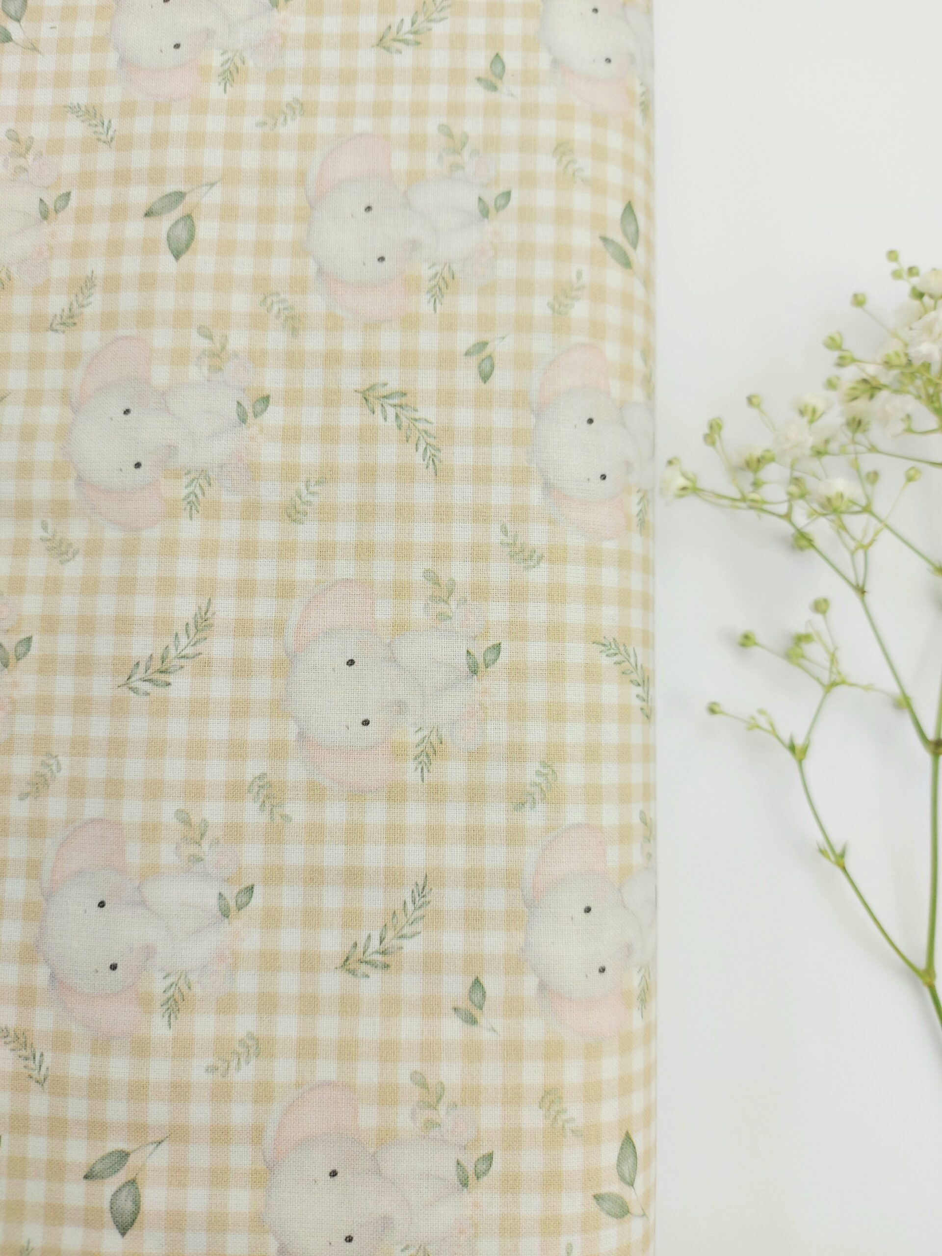 Popelín de algodón con un tierno estampado infantil 👶 que combina un cuadro vichy pequeño en tonos beige suave y blanco 🤍 con adorables elefantitos 🐘 en acabado delicado y ramitas en verde empolvado 🌿. El diseño es dulce, calmado y muy armonioso, ideal para crear un ambiente acogedor y natural.