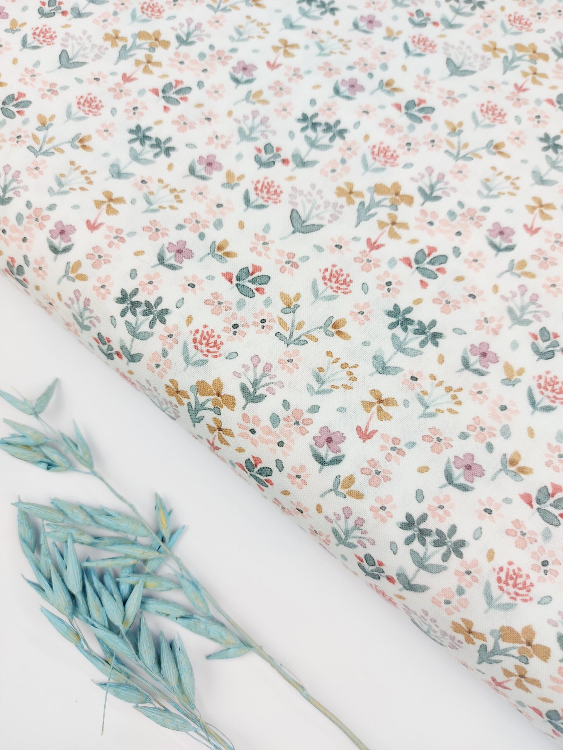 Este encantador popelín de algodón es pura delicadeza y armonía. Sobre una base blanca luminosa, florece un precioso estampado de pequeñas flores silvestres en tonos suaves: verde azulado empolvado, rosa, malva rojo inglés y toques de mostaza, creando un conjunto equilibrado, natural y muy acogedor.