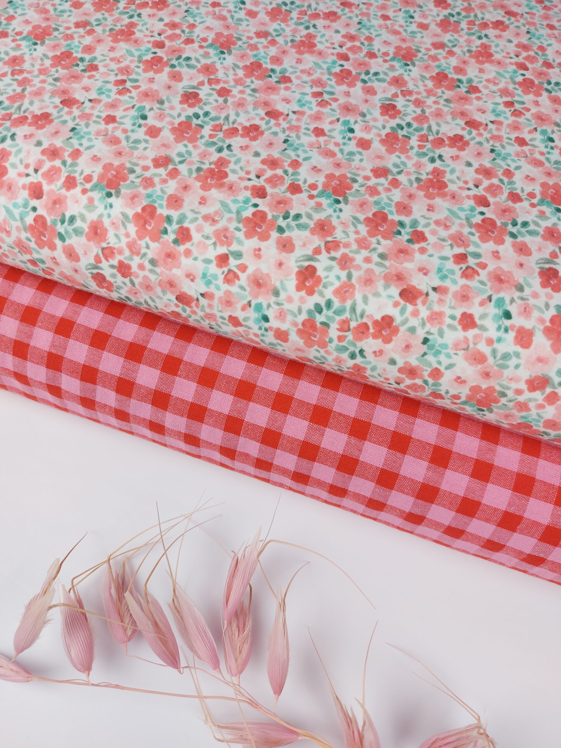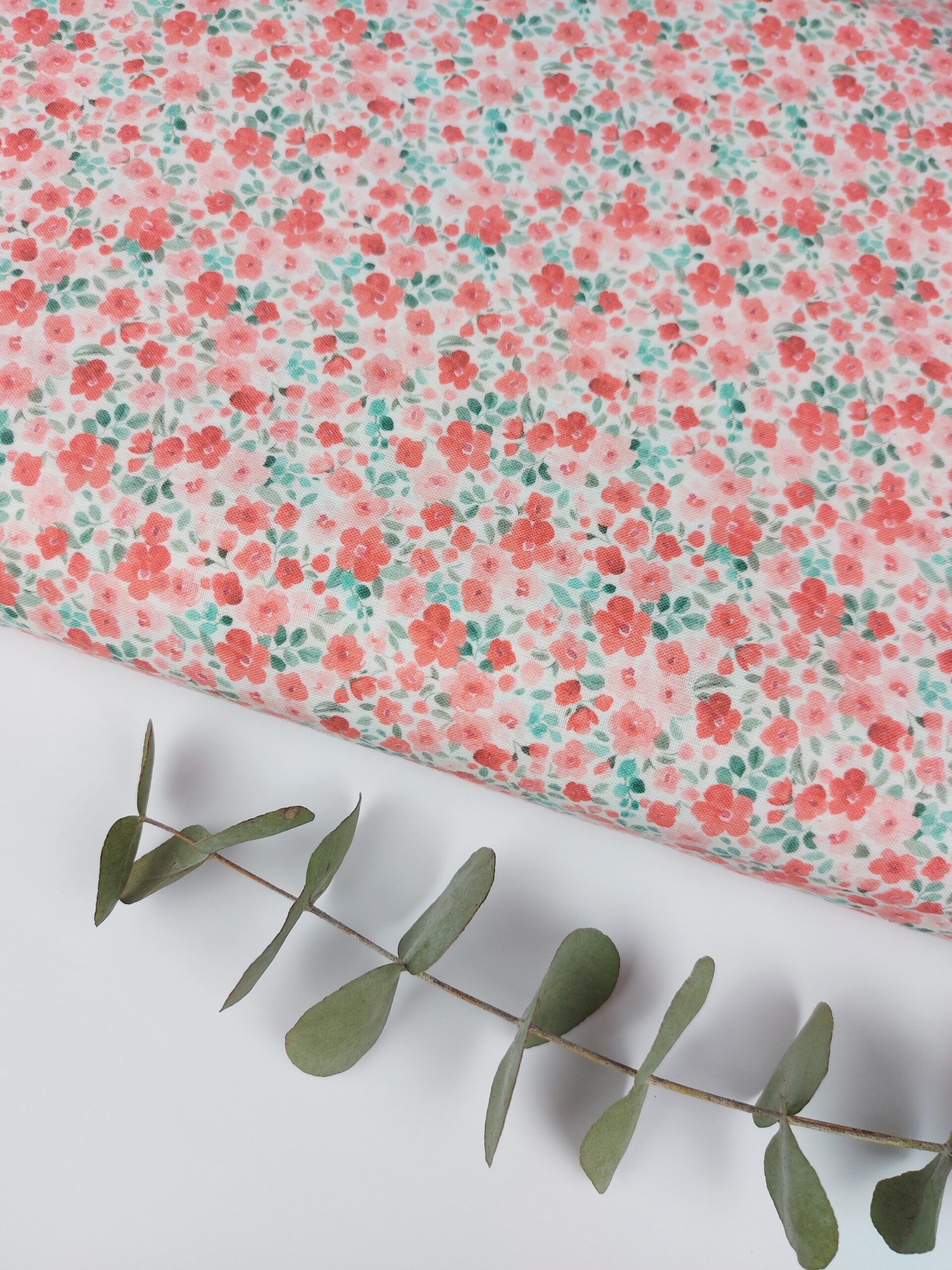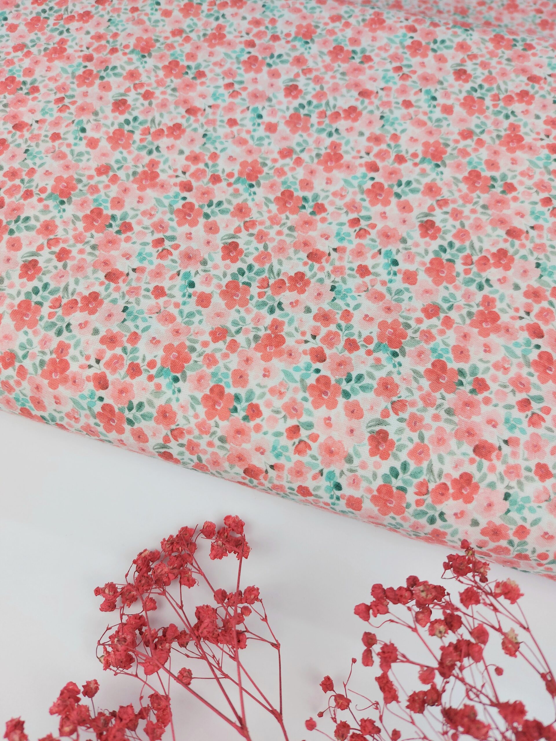 Tejido de algodón Premium con estampado de flores pequeñas y detalladas en color verde suave, verde mint con tonos acuarelados en coral sandía y rosa frambuesa suave sobre un fondo blanco que realza la suavidad del estampado. Estas flores varian en forma y tamaño creando un efecto visual armonioso y natural. Es un estilo veraniego para proyectos con toque alegre. Medida detalle: 1 cm mide de ancho la flor rosa. Composición: 100 % Algodón. Ancho Tela: 150cm. Gramaje: 125 gr/m2.