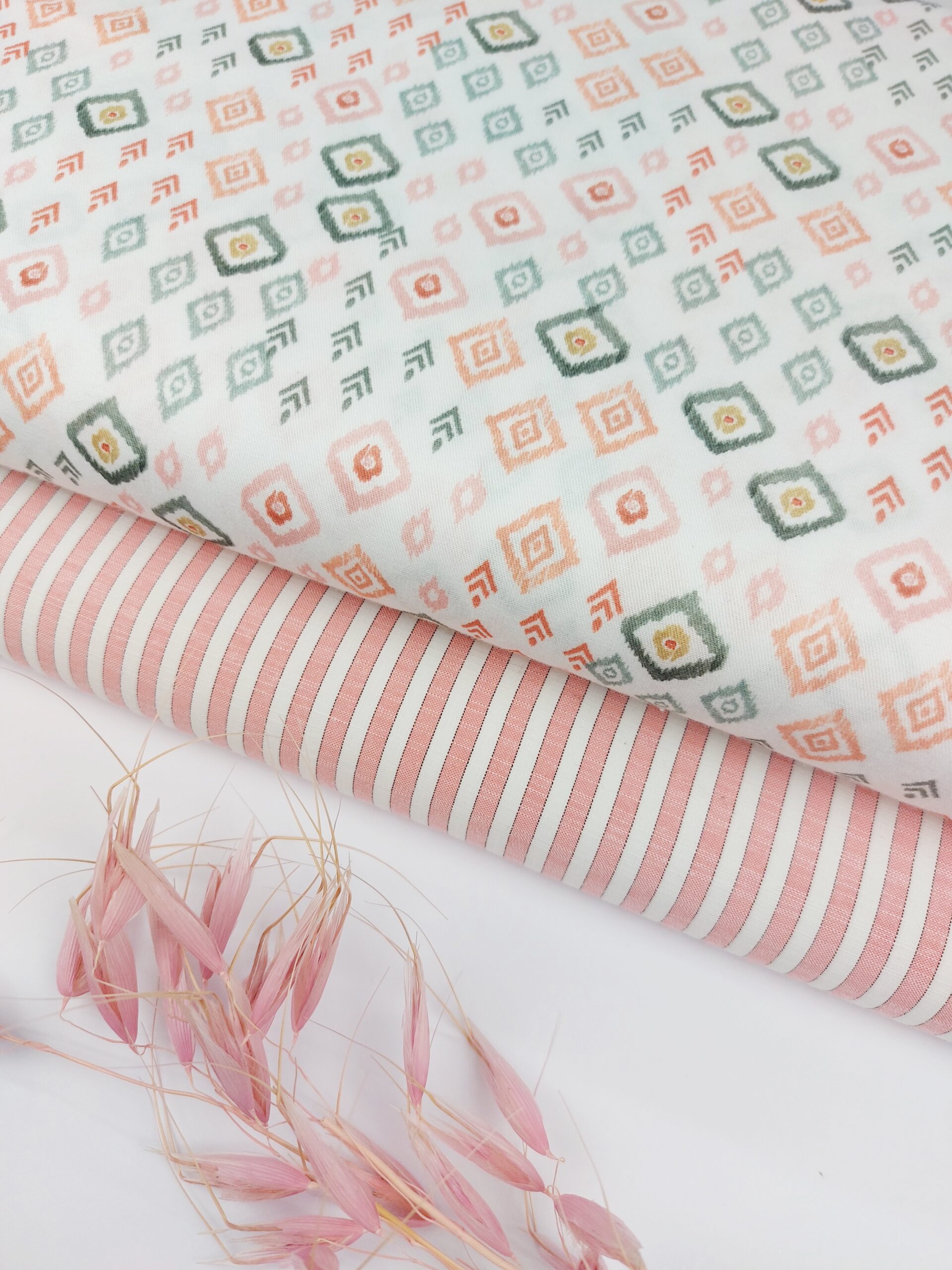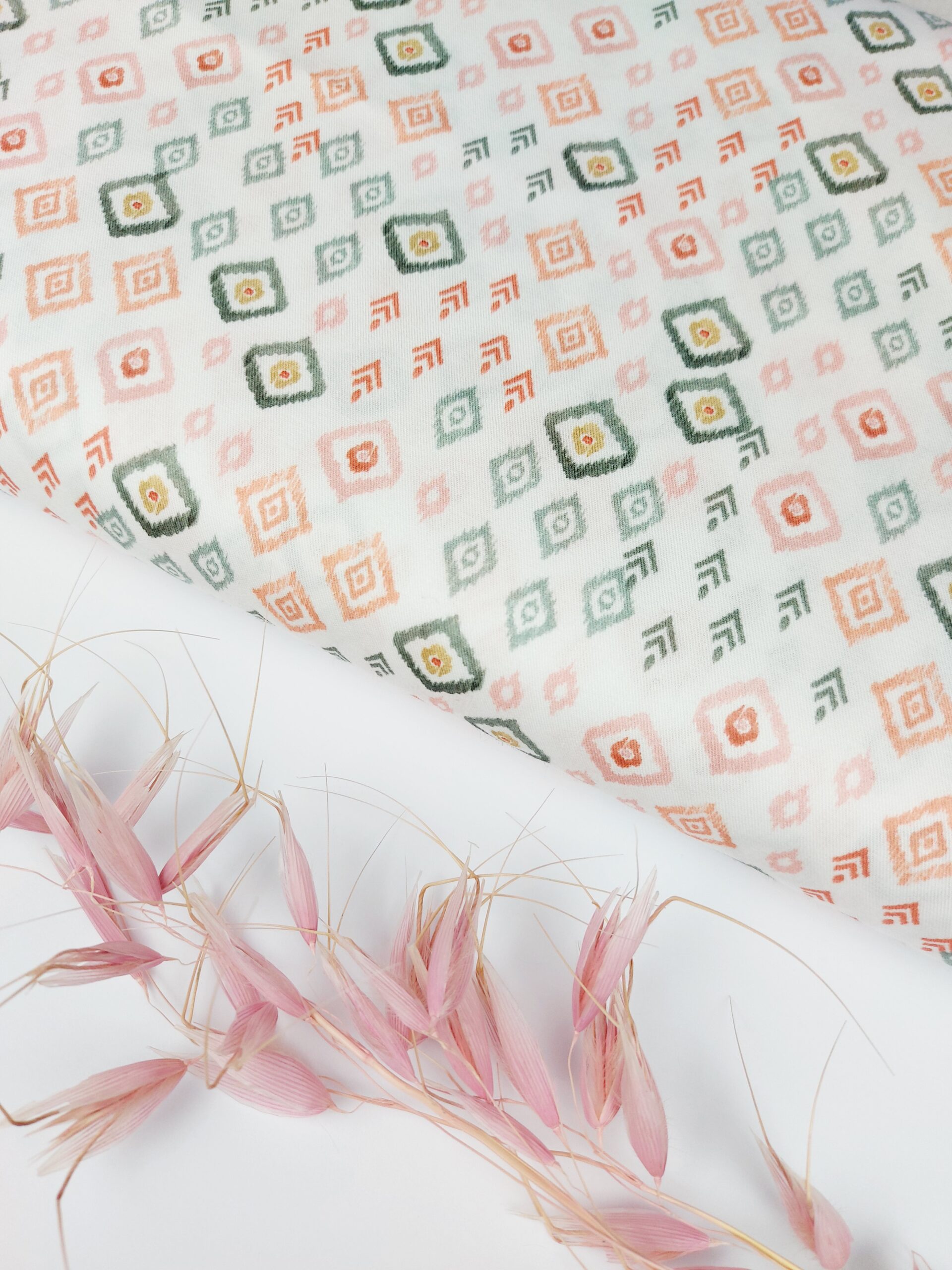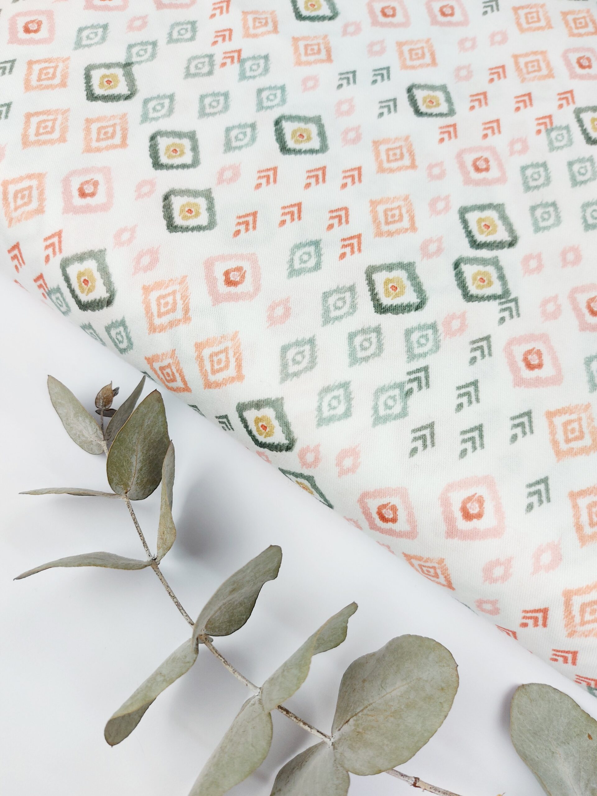 Tela de batista popelín premium en estampado geómetrico en tonos verdes, naranjas, rosa nude sobre un fondo blanco. El estampado está compuesto por formas de rombos y pequeños detalles étnicos o tribales lo que da un aire bohemio y artesanal con una vainíca. Composición: 100% Algodón. Ancho Tela: 145 cm. Gramaje: 105 gr/m2.