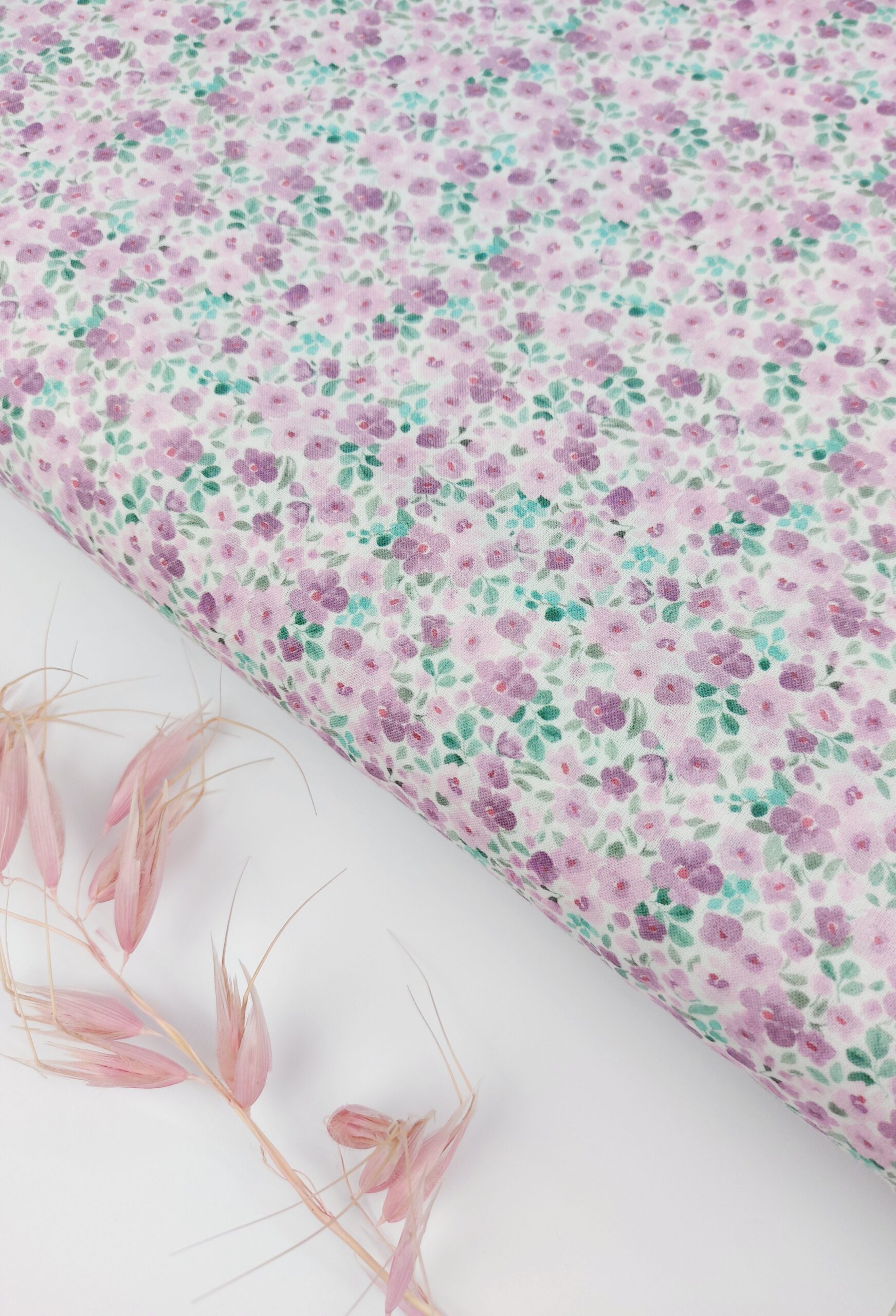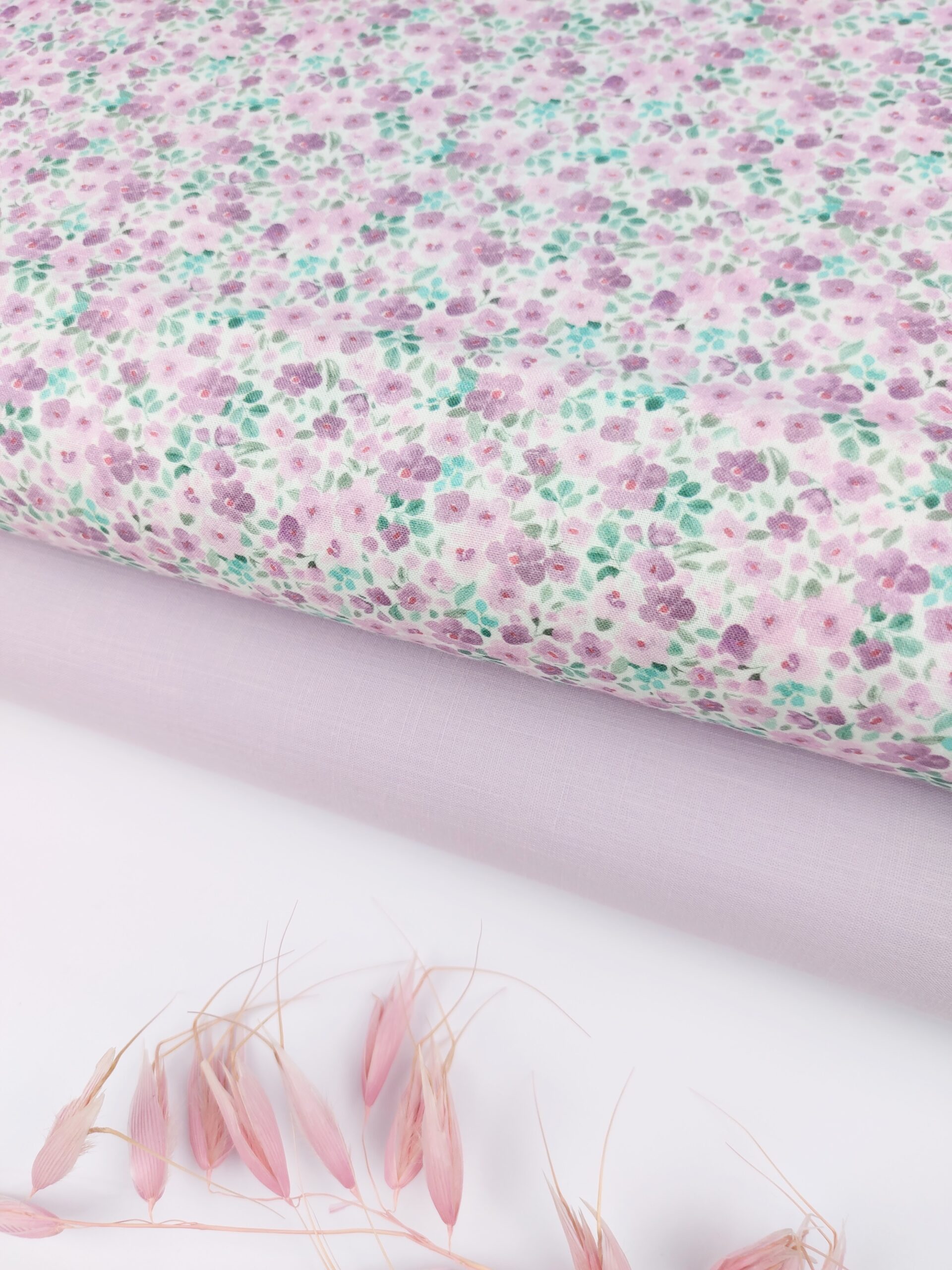 Tejido de algodón Premium con estampado de flores pequeñas y detalladas en color verde suave, verde mint con tonos acuarelados entre lavanda suave y malva vintage con un fondo blanco que realza la suavidad del estampado. Estas flores varian en forma y tamaño creando un efecto visual armonioso y natural. Es un estilo veraniego para proyectos con toque alegre. Medida detalle: 1 cm mide de ancho la flor rosa. Composición: 100 % Algodón. Ancho Tela: 150cm. Gramaje: 125 gr/m2.