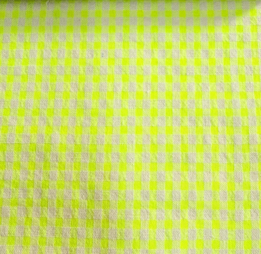 Tela de cuadro vichy seersucker en color amarillo flúor y beige. El cuadro vichy es seersucker por lo que es ligeramente arrugado, podrá ver el cuadro por el derecho y el revés de la tela. Medida cuadro: 0.3 cm. Ancho Tela: 150 cm. Composición: 60% Algodón 40% Poliéster. Gramaje: 150 gr/m2.