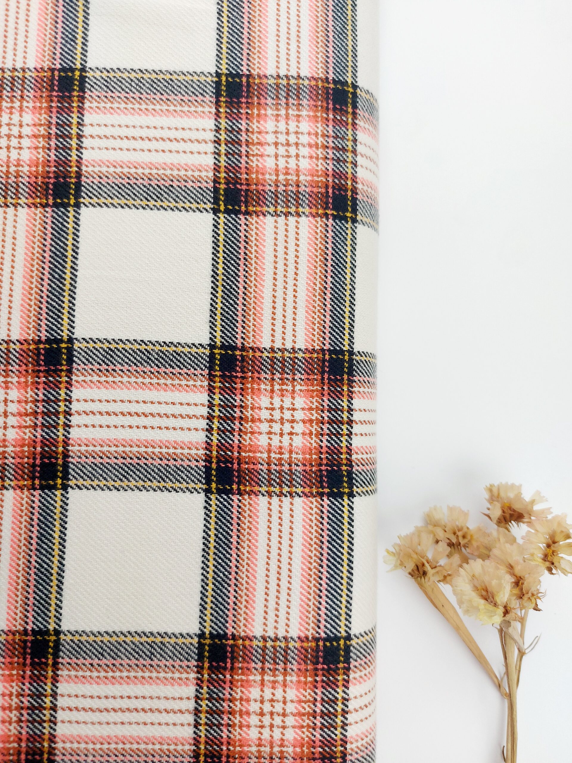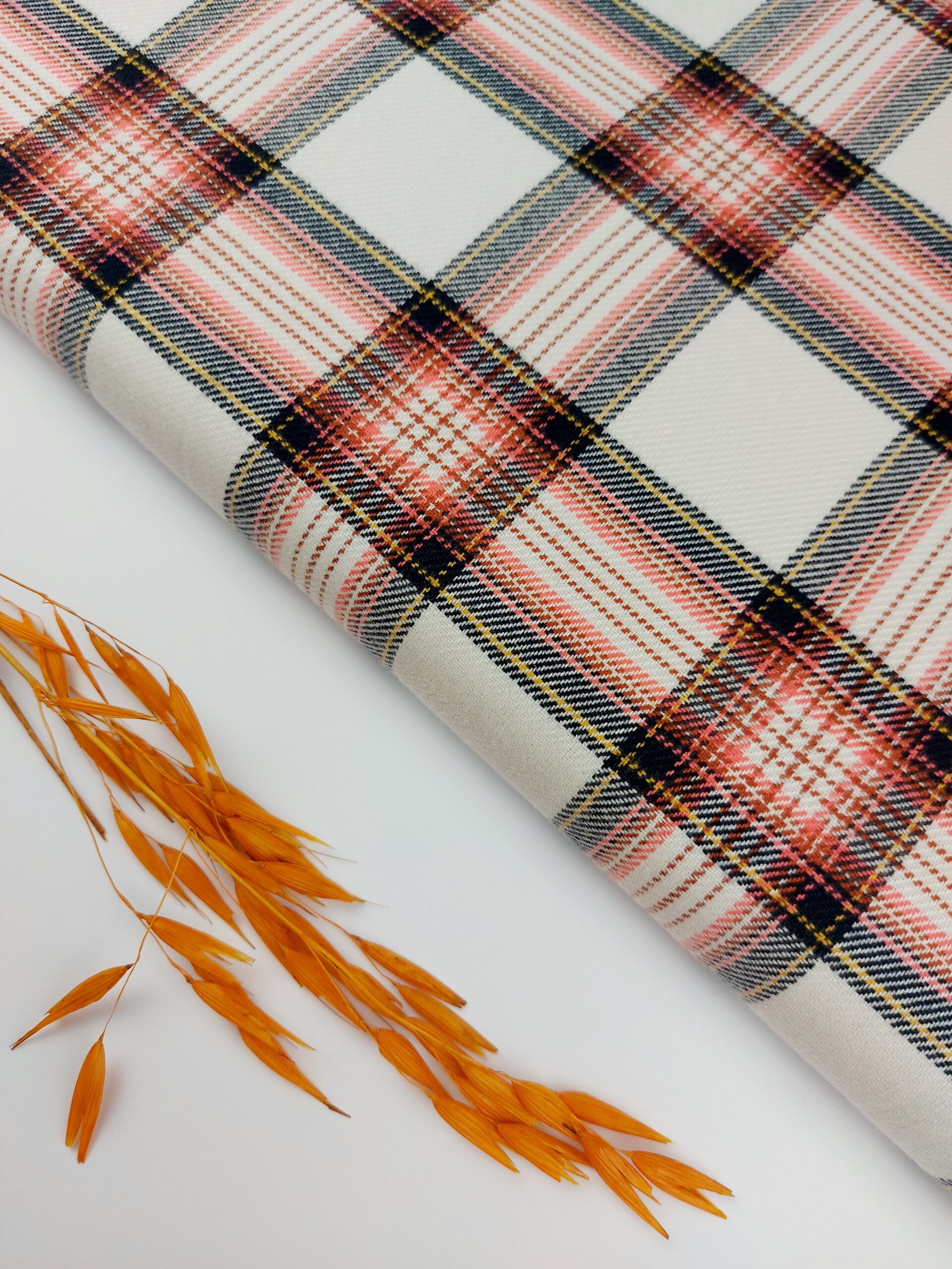 Se trata de una tela de cuadros escoceses con base en tono blanco roto, decorada con un patrón clásico de cuadros grandes. Los colores protagonistas del diseño son:
