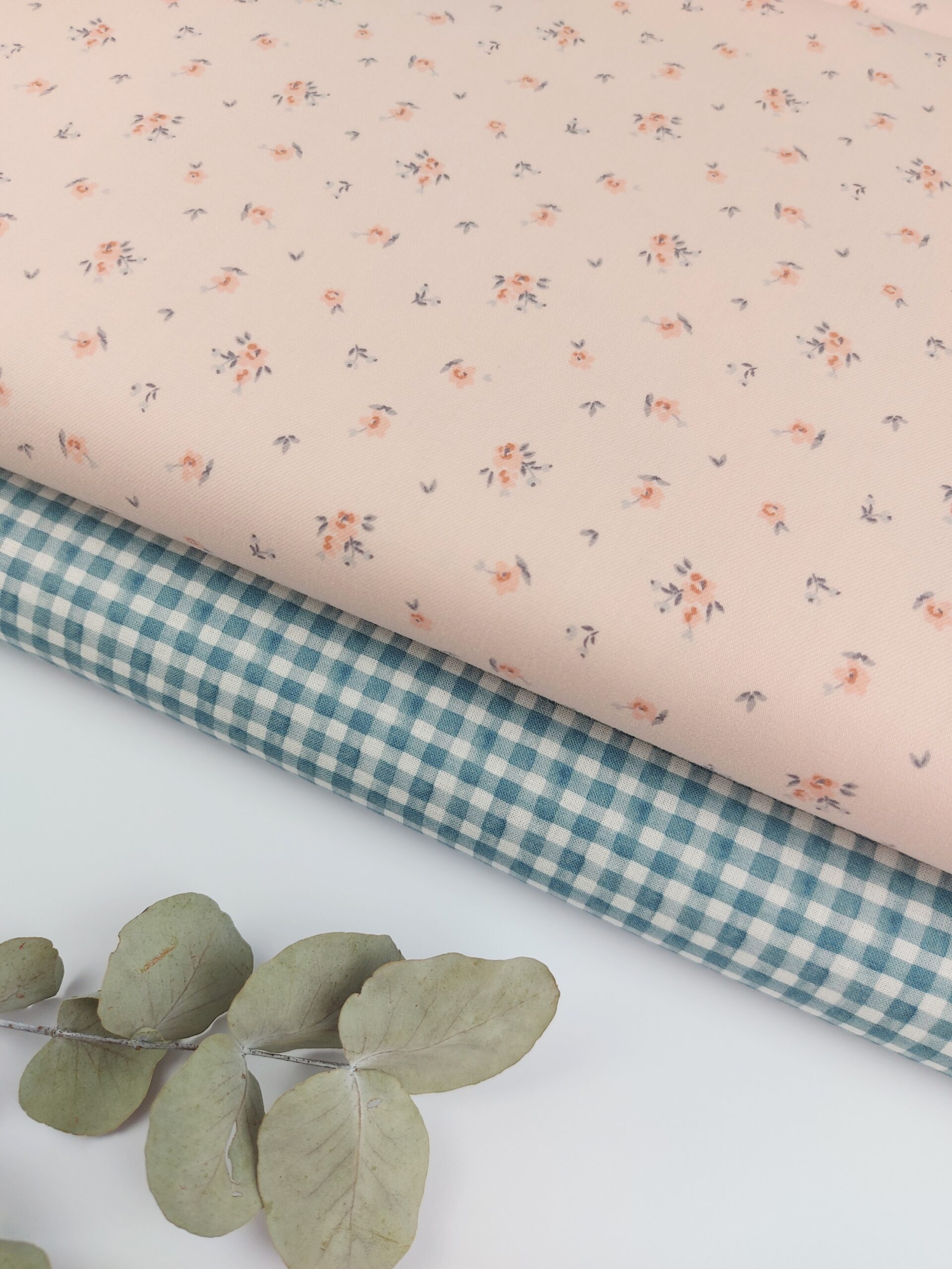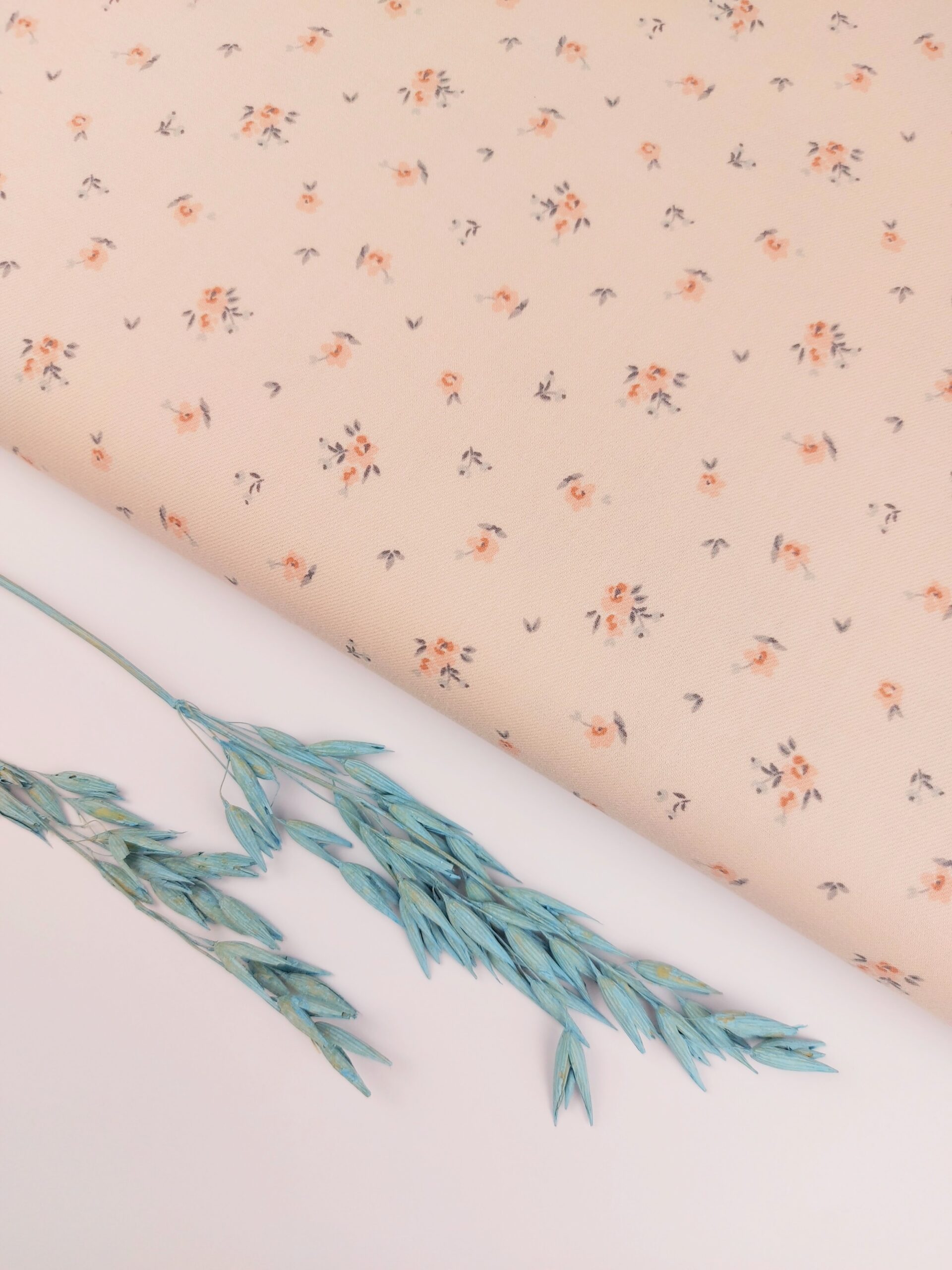 🎨 Estampado: flores pequeñas y espaciadas en coral suave con hojitas en gris y azul-grisáceo sobre fondo rosa empolvado claro