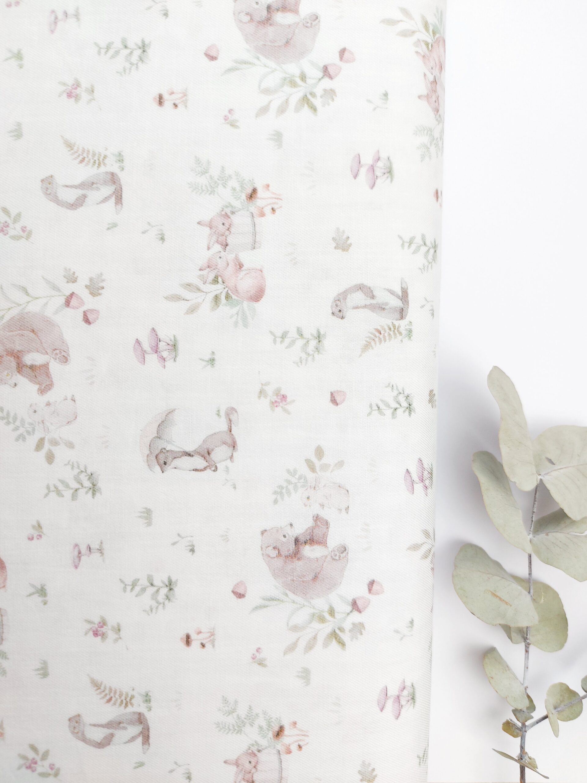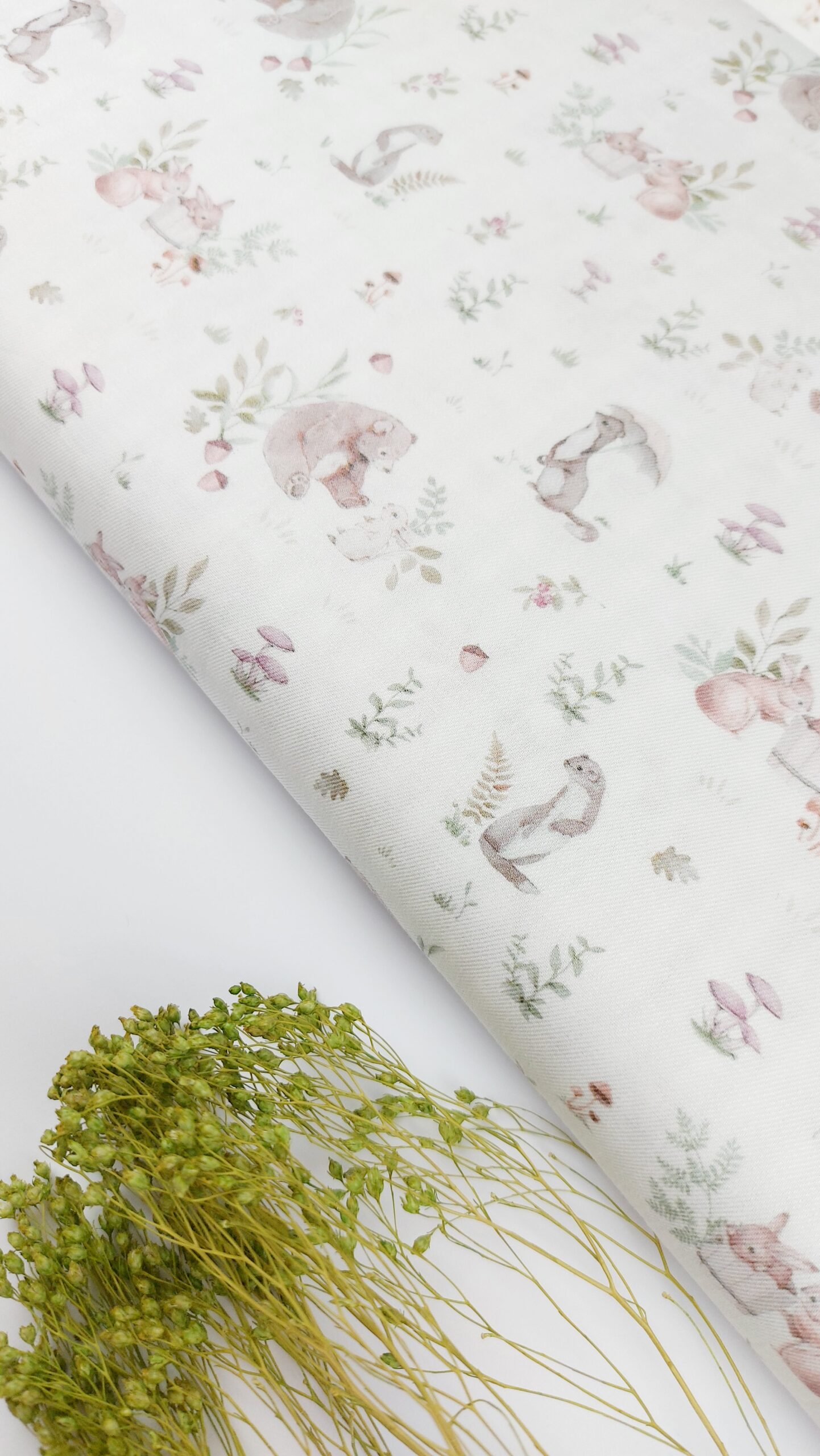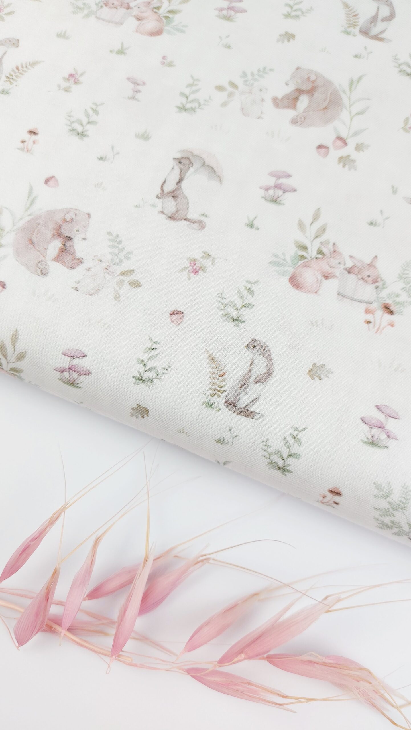 Tela de algodón de viyela con base en blanco roto, decorada con un delicado y tierno estampado de animalitos del bosque: osos, conejos, zorritos y pequeñas comadrejas, acompañados de setas, bellotas y ramitas verdes. Los tonos predominantes son pasteles suaves , nude, marrón claro, beige, verde menta y toques malva, creando un efecto dulce, armonioso y muy infantil.